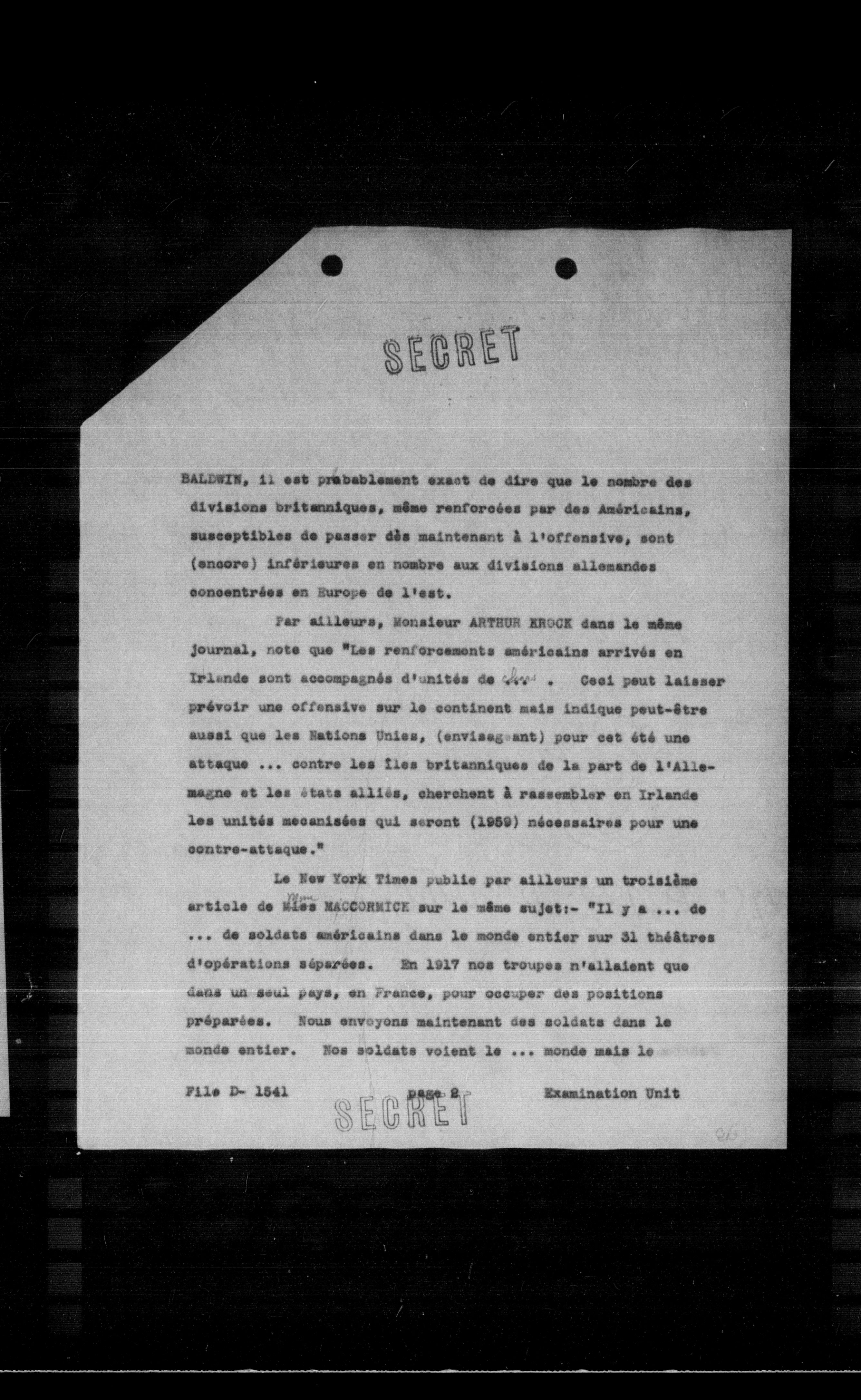 Par ailleurs, Monsieur ARTHUR KROCK dans le même journal, note que "Les renforcements américains arrivés en Irlande sont accompagnés d'unités de WVV' . Ceci peut laisser prévoir une offensive sur le continent mais indique peut-être aussi que les Nations Unies, (envisagant) pour cet été une attaque ... contre les îles britanniques de la part de l'Allemagne et les états alliés, cherchent à rassembler en Irlande les unités mécanisées qui seront (1959) nécessaires pour une contre-attaque."