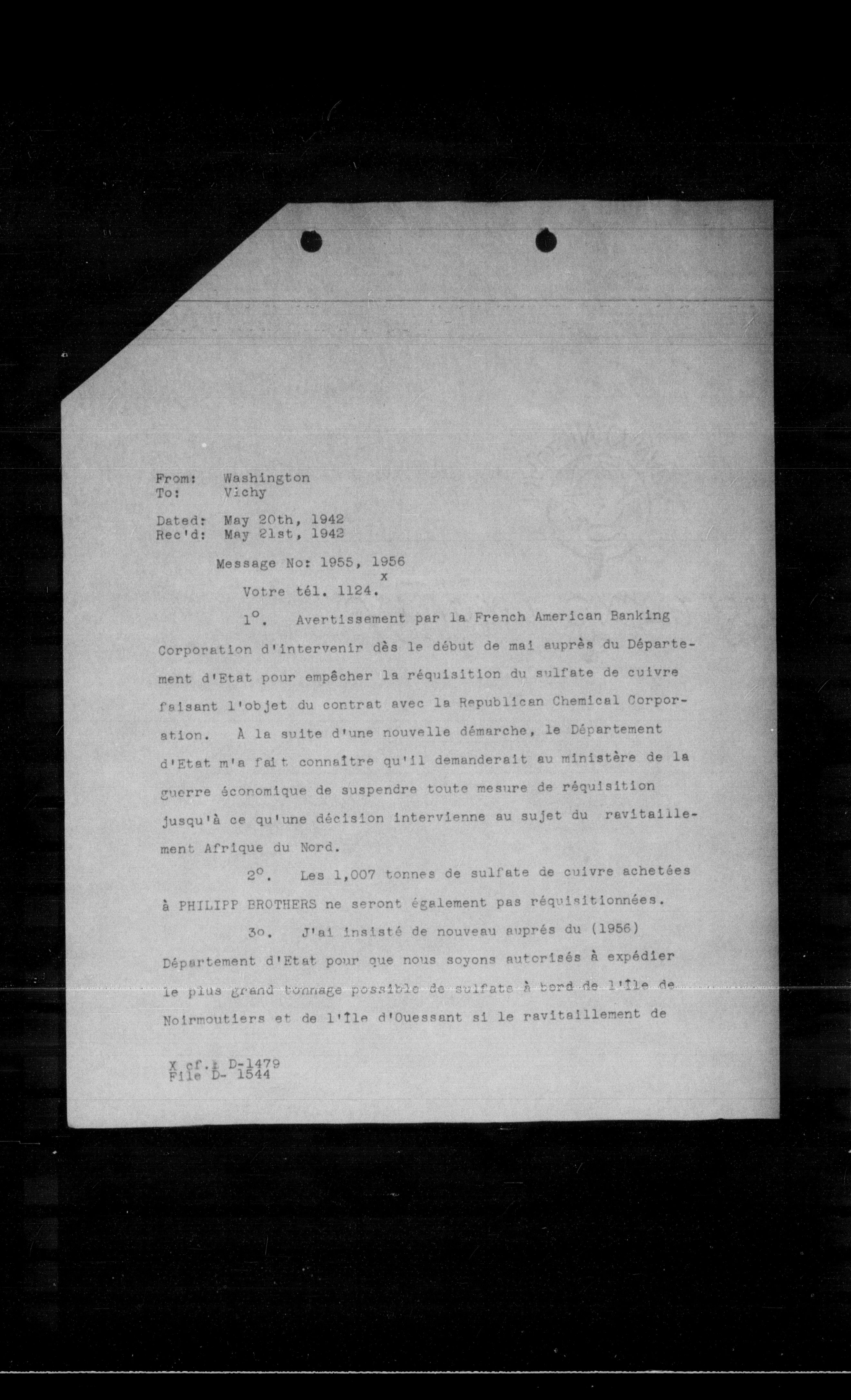 Corporation d'intervenir dès le début de mai auprès du Département d'Etat pour empêcher la réquisition du sulfate de cuivre faisant l'objet du contrat avec la Republican Chemical Corporation. A la suite d'une nouvelle démarche, le Département d'Etat m'a fait connaître qu'il demanderait au ministère de la guerre économique de suspendre toute mesure de réquisition jusqu'à ce qu'une décision intervienne au sujet du ravitaillement Afrique du Nord.