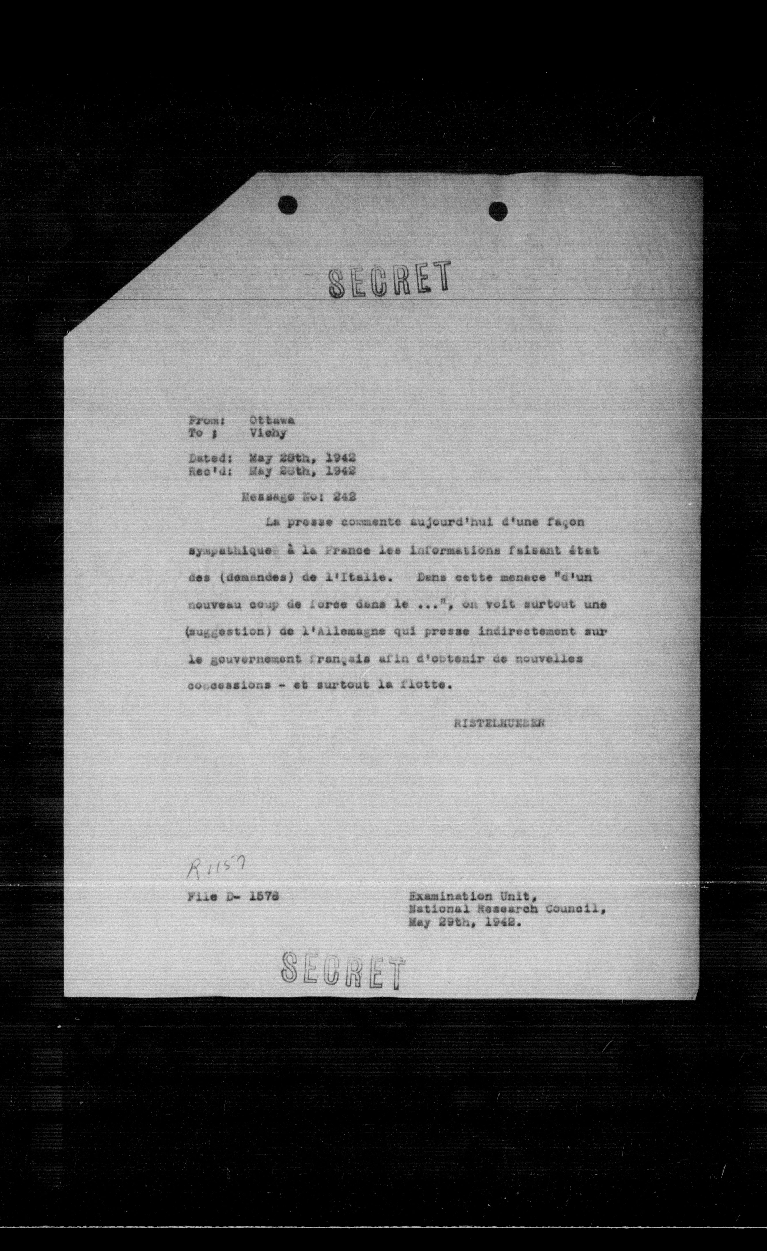 File D- 1578 Examination Unit, National Research Council, May 29th, 1942.