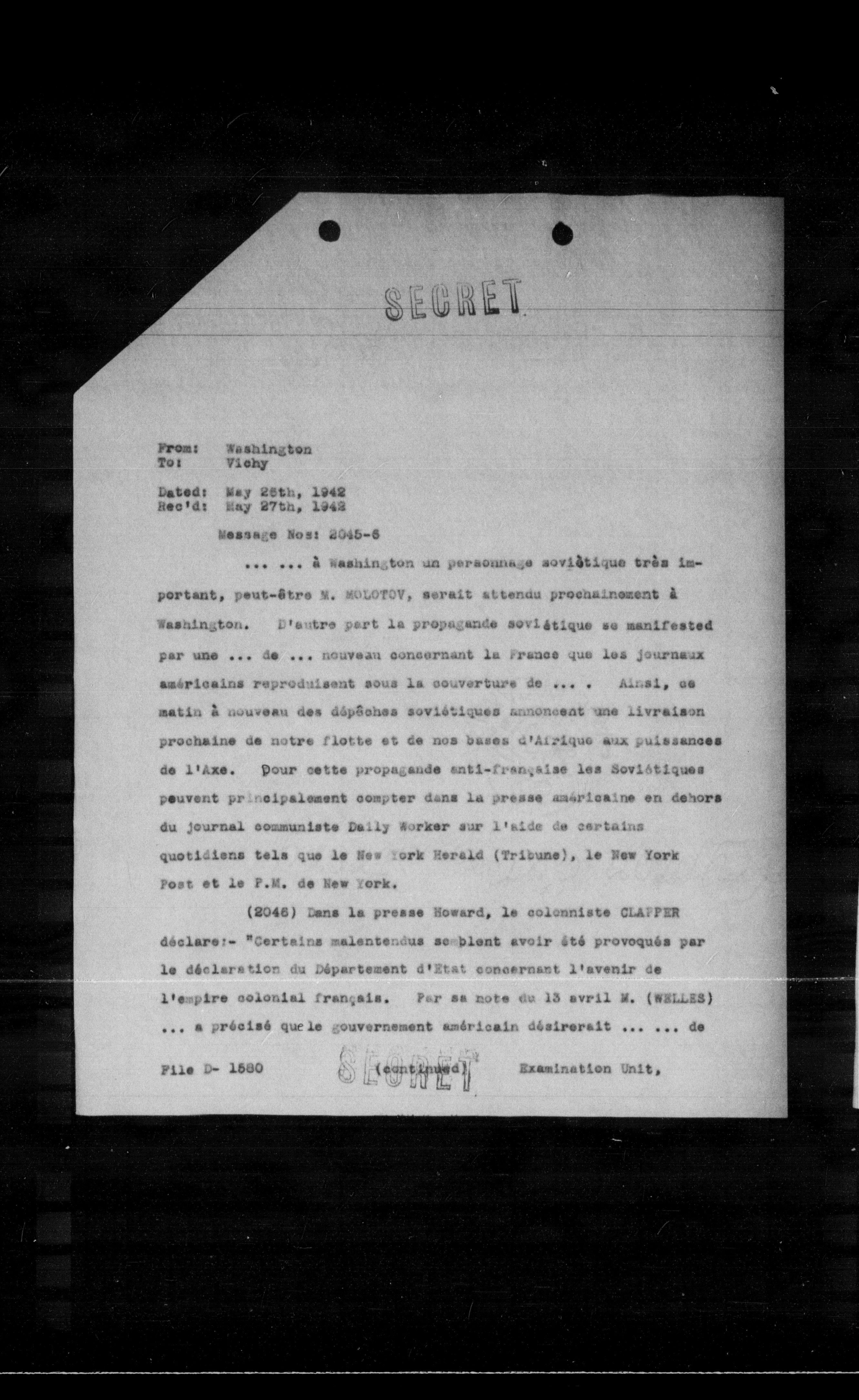 (2046) Dans la presse Howard, le colonniste CLAPPER déclare: "Certains malentendus semblent avoir été provoqués par le déclaration du Département d'Etat concernant l'avenir de l'empire colonial français. Par sa note de 13 avril M. (WELLES) ... a précisé qu'le gouvernement américain désirerait ... ... de