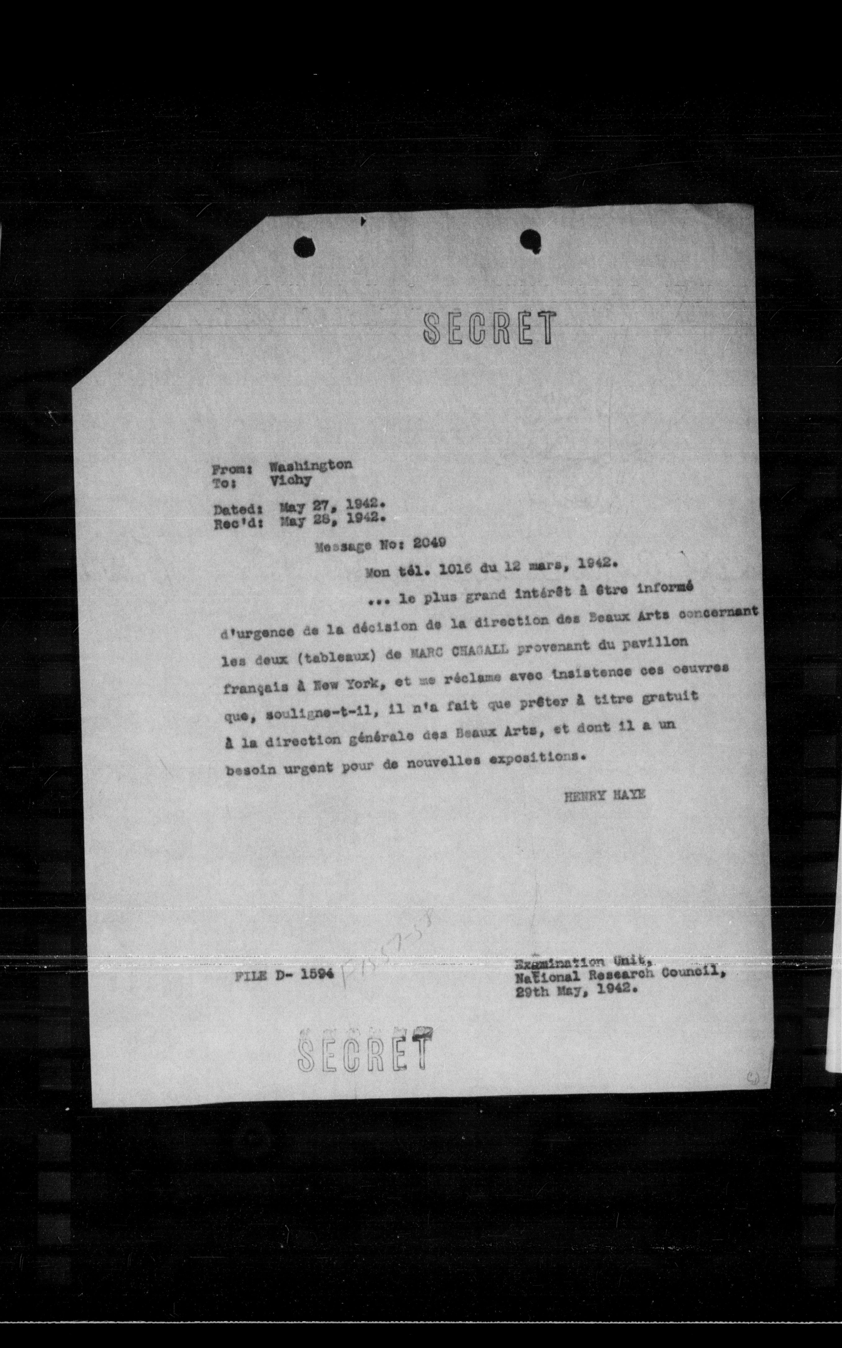 d'urgence de la décision de la direction des Beaux Arts concernant les deux (tableaux) de MARC CHASALL provenant du pavillon français à New York, et me réclame avec insistance ces oeuvres que, souligne-t-il, il n'a fait que prêter à titre gratuit à la direction générale des Beaux Arts, et dont il a un besoin urgent pour de nouvelles expositions.