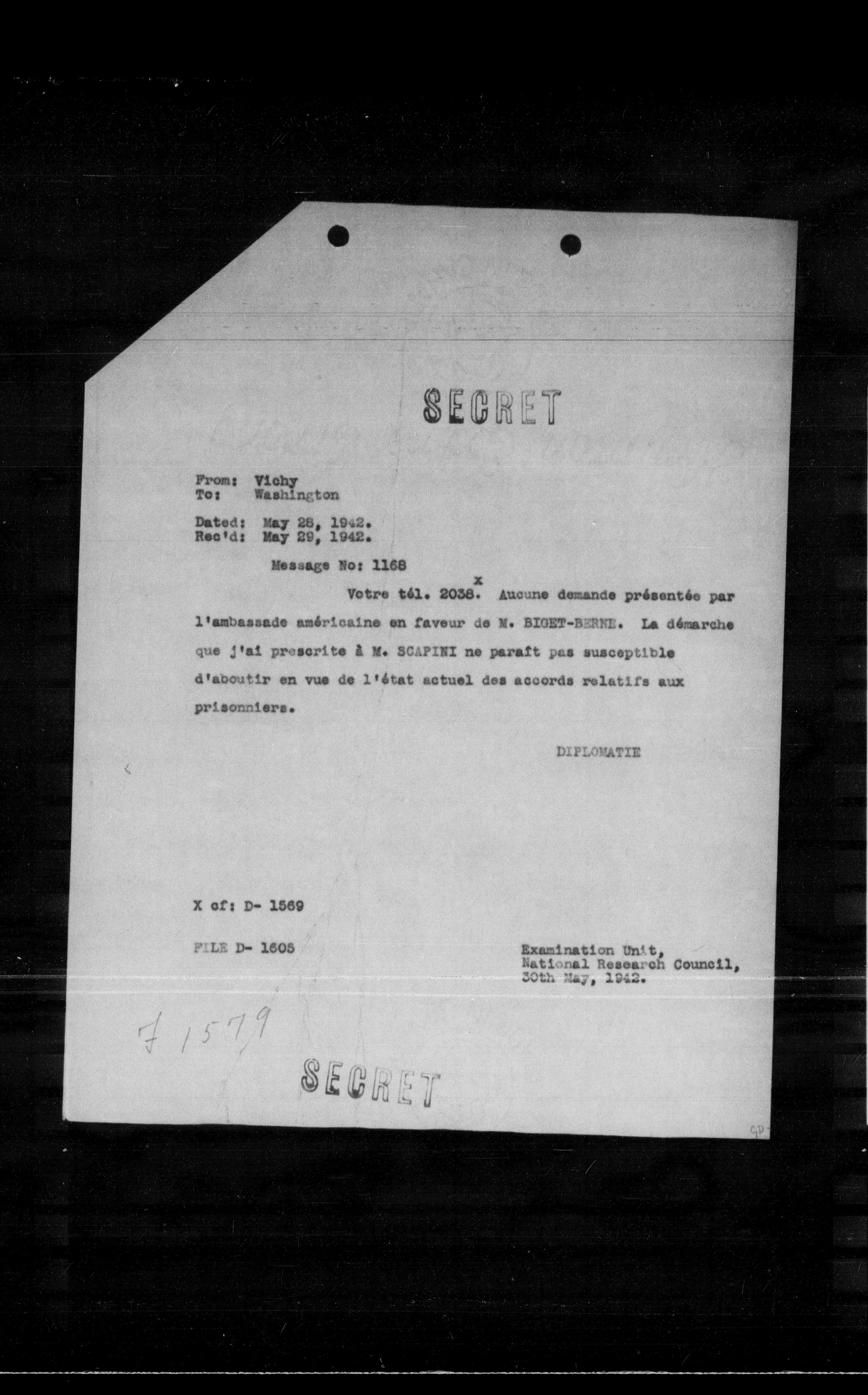 Votre tél. 2038. Aucune demande présentée par l'ambassade américaine en faveur de M. BIOET-BERNE. La démarche que j'ai prescrite à M. SCAPINI ne paraît pas susceptible d'aboutir en vue de l'état actuel des accords relatifs aux prisonniers.