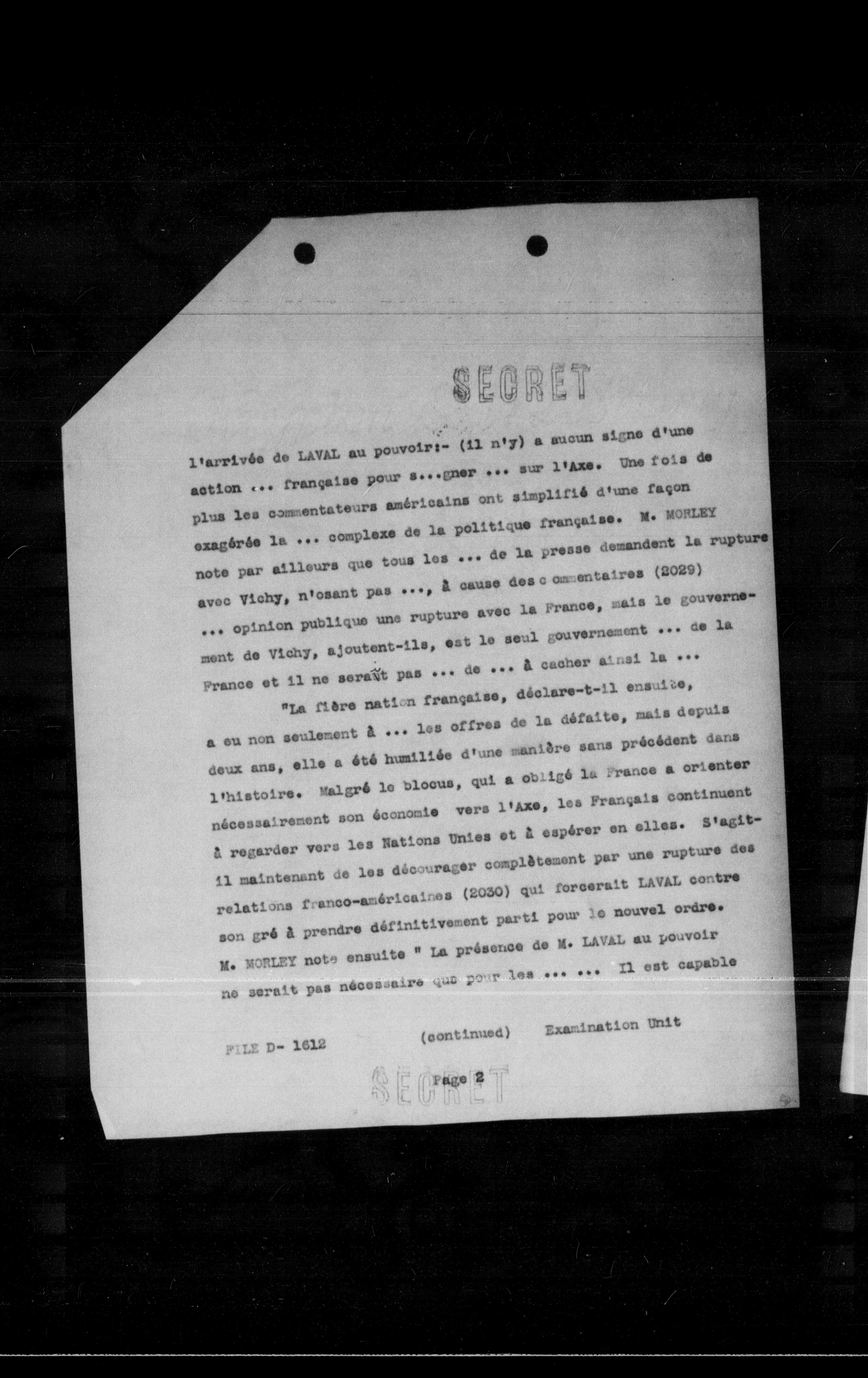 "La fière nation française, déclare-t-il ensuite, a eu non seulement a ... les offres de la défaite, mais depuis deux ans, elle a été humiliée d'une manière sans précédent dans l'histoire. Malgré le blocus, qui a obligé la France a orienter nécessairement son économie vers l'Axe, les Français continuent a regarder vers les Nations Unies et a espérer en elles. S'agitil maintenant de les décourager complètement par une rupture des relations franco-américaines (2030) qui forcerait LAVAL contre son gré à prendre définitivement parti pour le nouvel ordre. M. MORLEY note ensuite " La présence de M. LAVAL au pouvoir ne serait pas nécessaire que pour les ... ... Il est capable