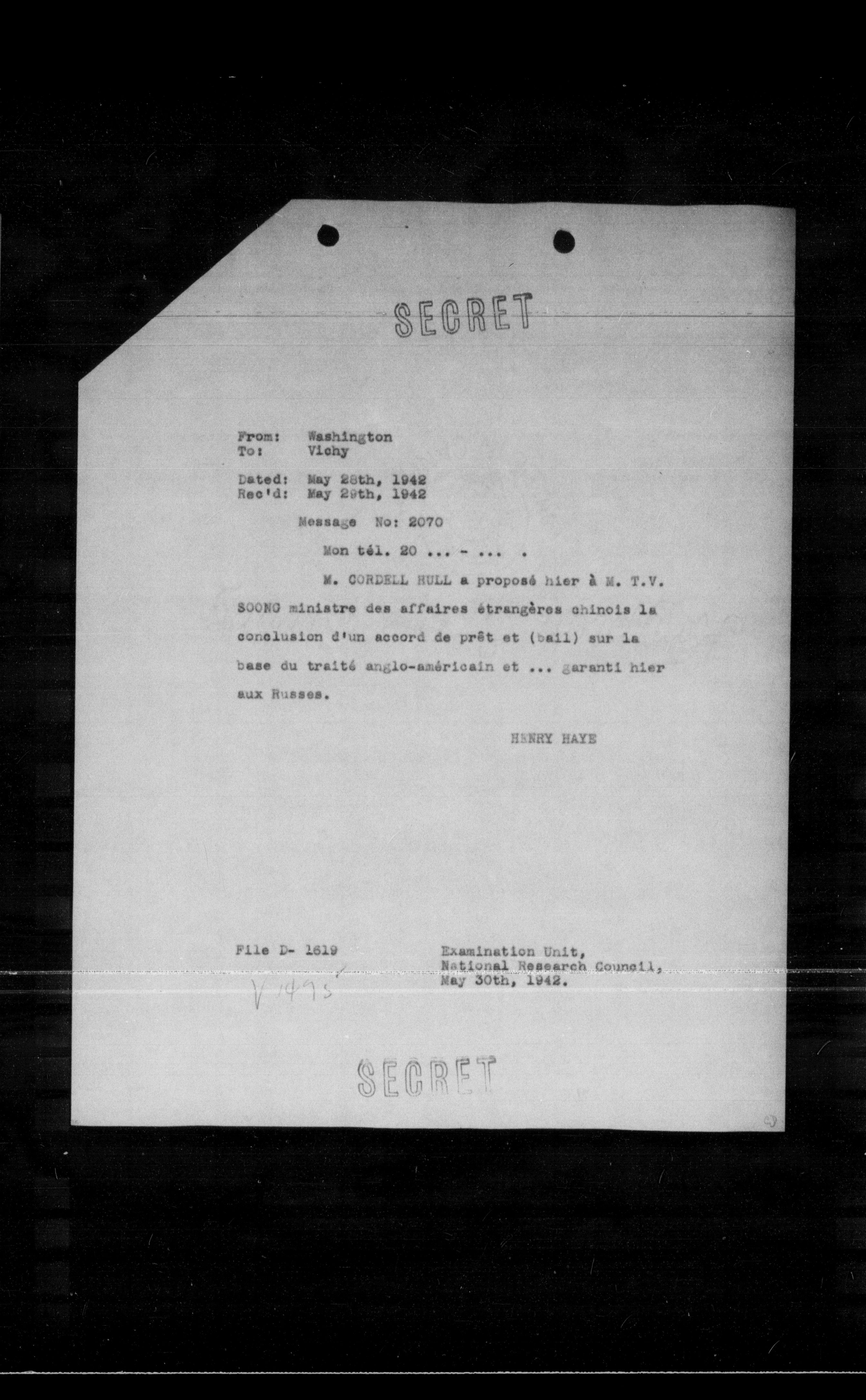 File D- 1819 Examination Unit, National Research Council, May 30th, 1942.