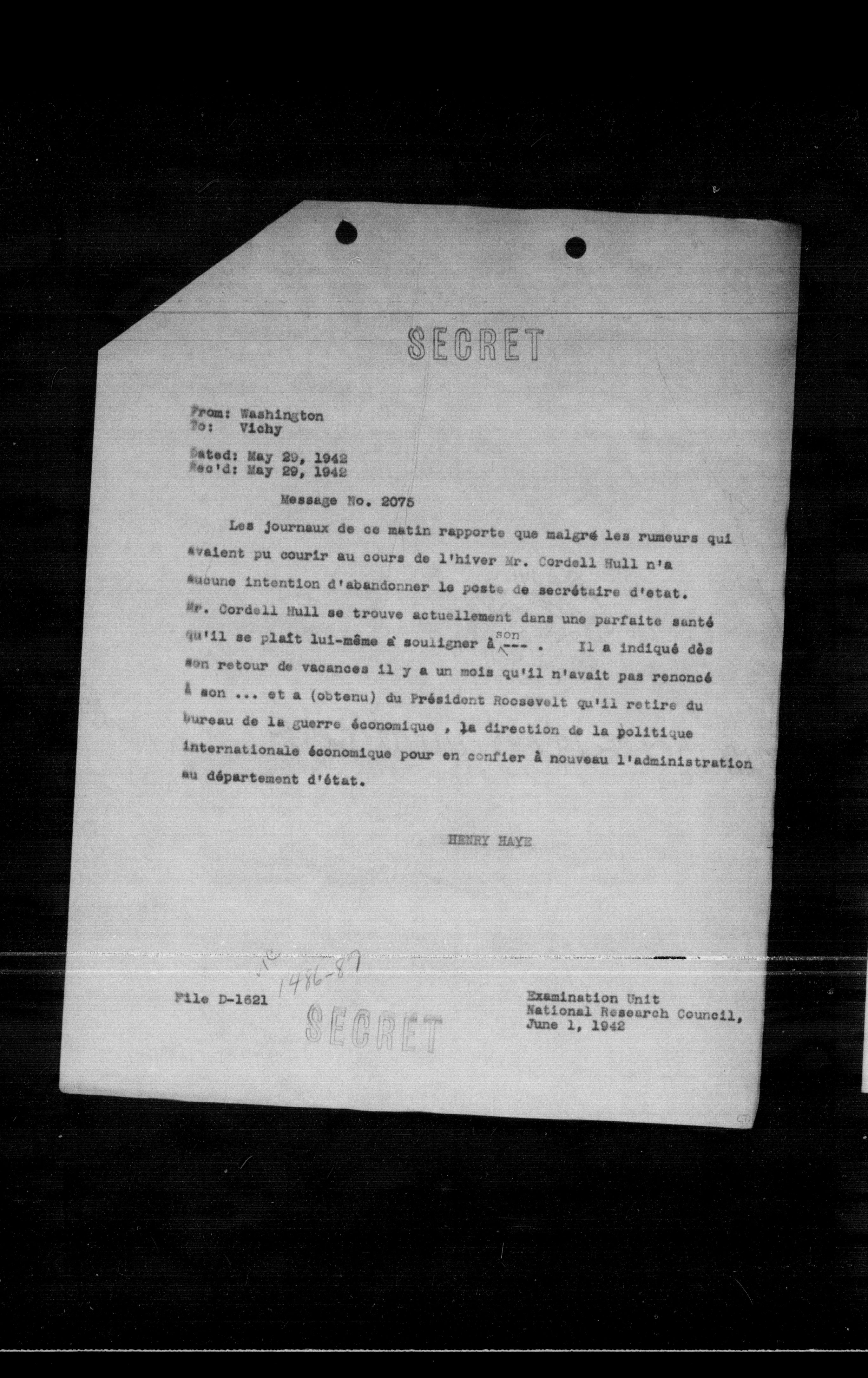 Les journaux de ce matin rapporte que malgré les rumeurs qui avalent pu courir au cours de l'hiver Mr. Cordell Hull n'a aucune intention d'abandonner le poste de secrétaire d'etat. Mr. Cordell Hull se trouve actuellement dans une parfaite santé qu'il se plait lui-même a souligner à ... . Il a indiqué des son retour de vacances il y a un mois qu'il n'avait pas renoncé à son ... et a (obtenu) du Président Roosevelt qu'il retire du bureau de la guerre économique, la direction de la politique internationale économique pour en confier à nouveau l'administration au département d'état.