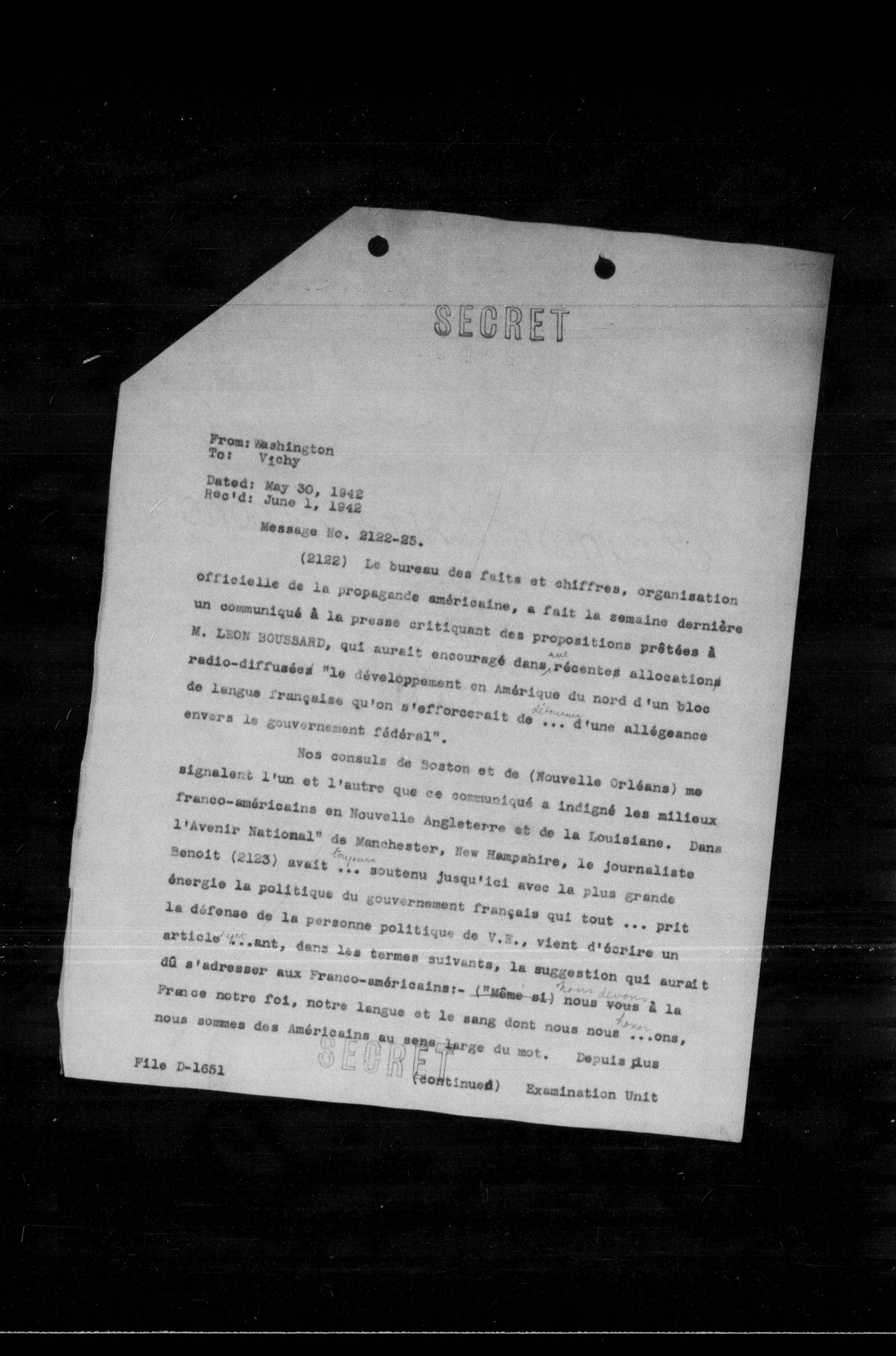 (2122) Le bureau des faits et chiffres, organisation officielle de la propagande américaine, a fait la semaine dernière un communiqué à la presse critiquant des propositions prêtées à M. LEON BOUSSARD, qui aurait encouragé dans récentes allocations radio-diffusées "le développement en Amérique du nord d'un bloc de langue française qu'on s'efforcerait de ... d'une allégeance envers le gouvernement fédéral".