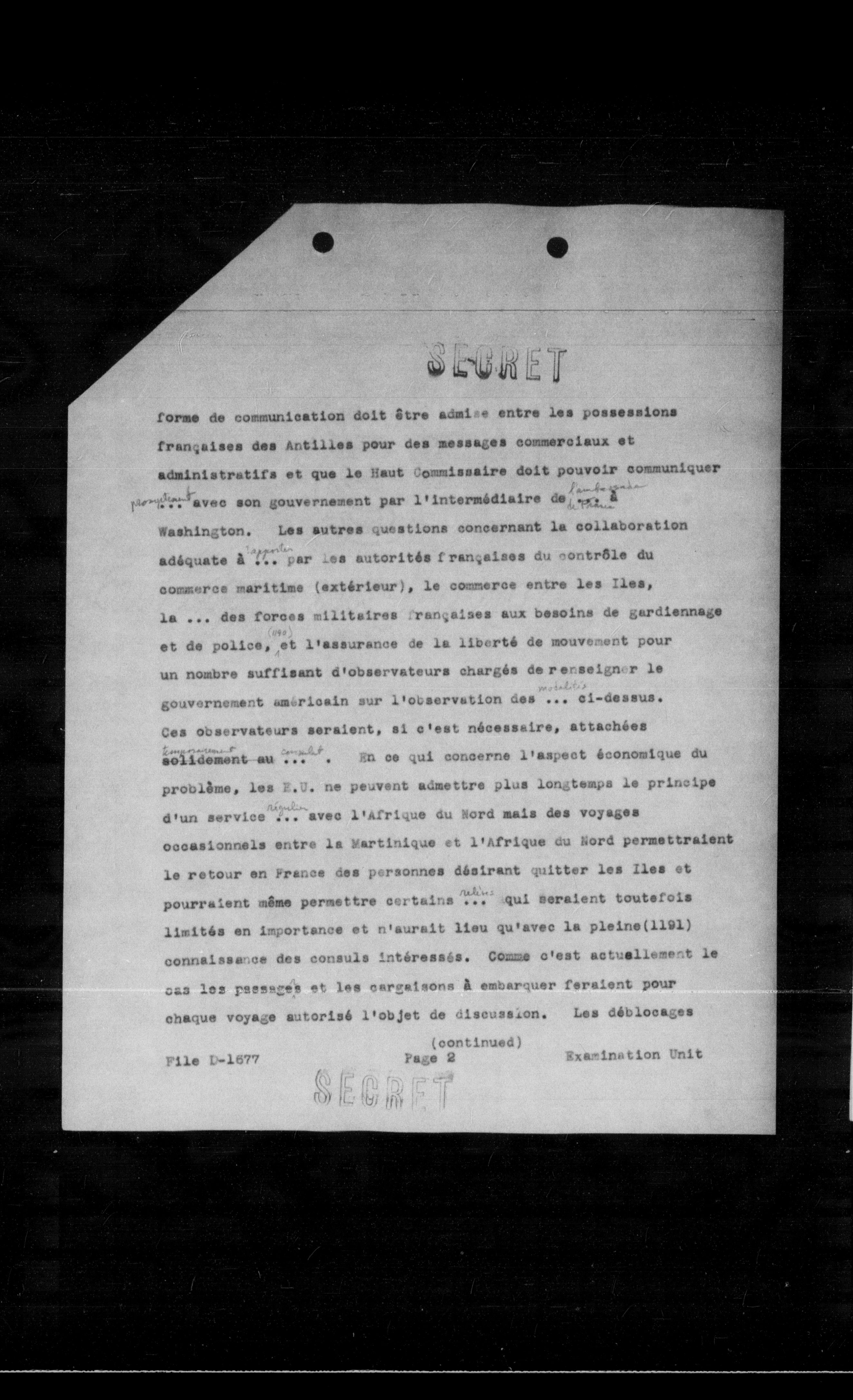 forme de communication doit être admise entre les possessions françaises des Antilles pour des messages commerciaux et administratifs et que le Haut Commissaire doit pouvoir communiquer avec son gouvernement par l'intermédiaire de Washington. Les autres questions concernant la collaboration adéquate à ... par les autorités françaises du contrôle du commerce maritime (extérieur), le commerce entre les iles, la ... des forces militaires françaises aux besoins de gardiennage et de police, et l'assurance de la liberté de mouvement pour un nombre suffisant d'observateurs chargés de renseigner le gouvernement américain sur l'observation des ... ci-dessus. Ces observateurs seraient, si c'est nécessaire, attachées solidement au ... En ce qui concerne l'aspect économique du problème, les E.U. ne peuvent admettre plus longtemps le principe d'un service avec l'Afrique du Nord mais des voyages occasionnels entre la Martinique et l'Afrique du Nord permettralen le retour en France des personnes désirent quitter les iles et pourraient même permettre certains qui seraient toutefois limités en importance et n'aurait lieu qu'avec la pleine(1191) connaissance des consuls intéressés. Comme c'est actuellement le cas les passages et les cargaisons à embarquer feraient pour chaque voyage autorisé l'objet de discussion. Les déblocages