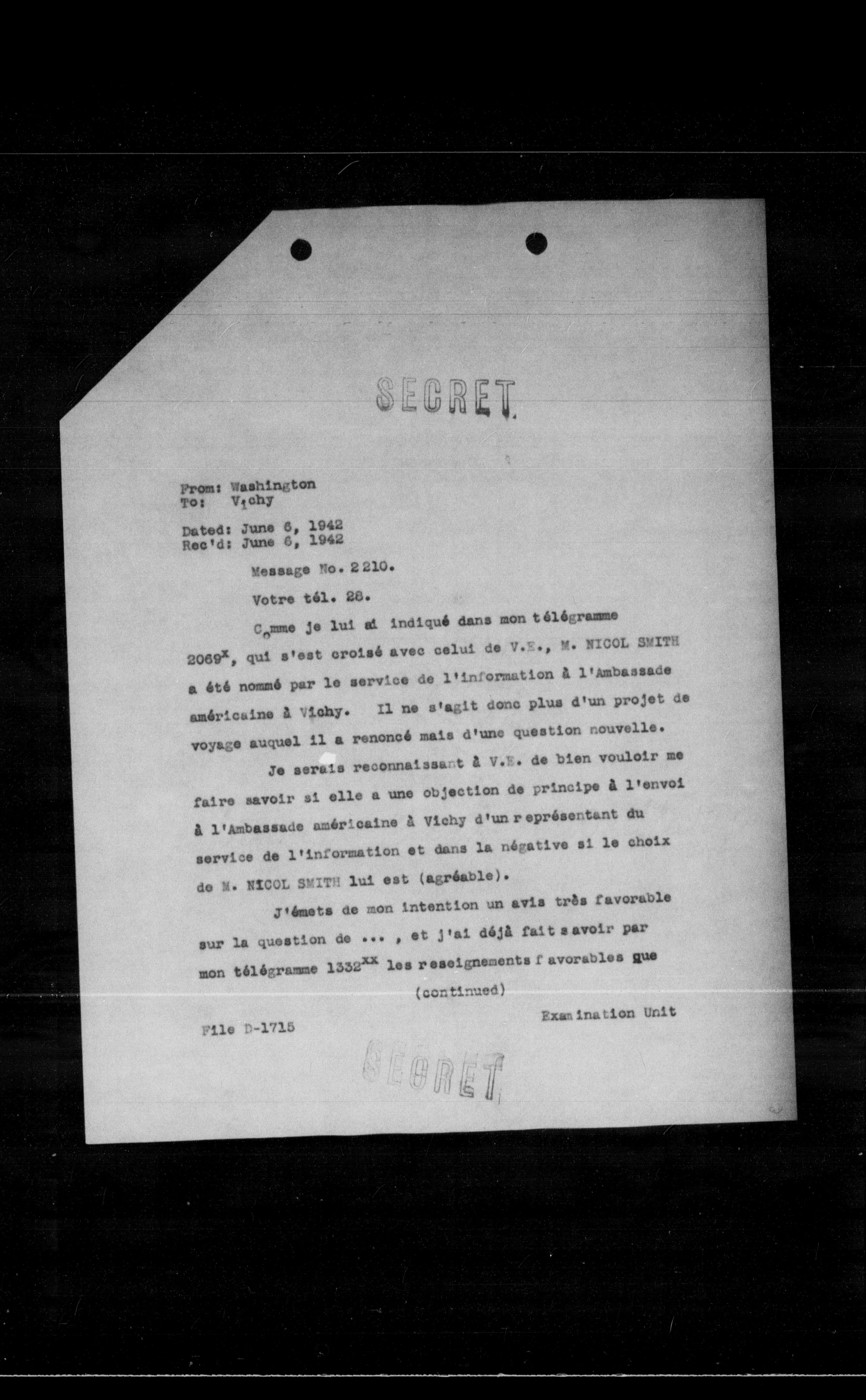 Comme je lui ai indiqué dans mon télégramme 2069, qui s'est croisé avec celui de V.N., M. NICOL SMITH a été nommé par le service de l'information à l'Ambassade américaine à Vichy. Il ne s'agit donc plus d'un projet de voyage auquel il a renoncé mais d'une question nouvelle.