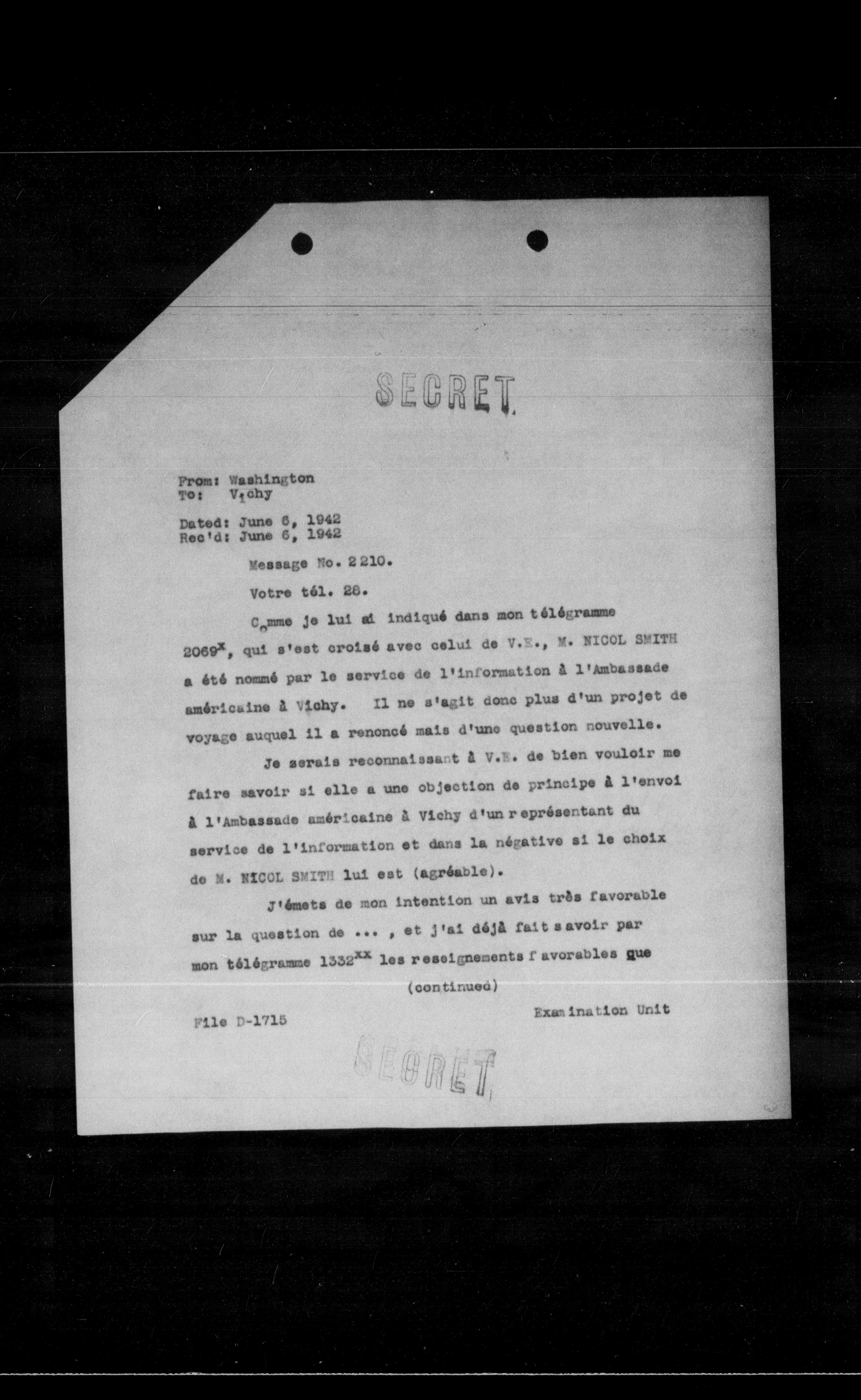 $2069^{x}$, qui s'est croisé avec celui de V.N., M. NICOL SMITH a été nommé par le service de l'in'ormation a l'Ambassade américaine a Vichy. Il ne s'agit donc plus d'un projet de voyage auquel il a renoncé mais d'une question nouvelle.
