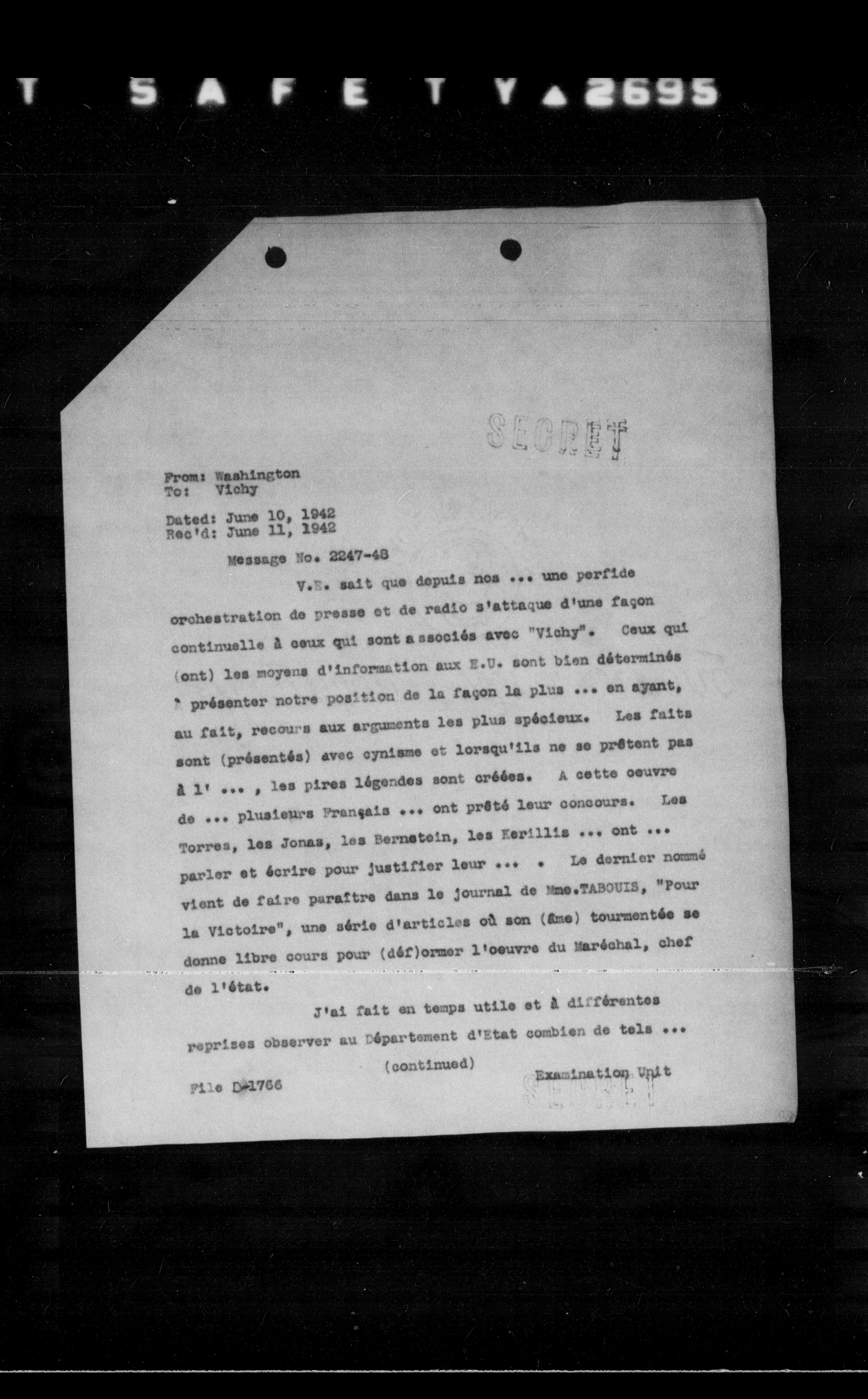 V.H. sait que depuis nos ... une perfide orchestration de presse et de radio s'attaque d'une façon continuelle à ceux qui sont associés avec "Vichy". Ceux qui (ont) les moyens d'information aux E.U. sont bien déterminés à présenter notre position de la façon la plus ... en ayant, au fait, recours aux arguments les plus spéciaux. Les faits sont (présentés) avec cynisme et lorsqu'ils ne se prêtent pas à l' ... , les pires légendes sont créées. À cette œuvre de ... plusieurs Français ... ont prêté leur concours. Les Torres, les Jonas, les Bernstein, les Kerillis ... ont ... parler et écrire pour justifier leur ... . Le dernier nommé vient de faire paraître dans le journal de Mme. TABOUIS, "Pour la Victoire", une série d'articles où son (âme) tourmentée se donne libre cours pour (défformer l'œuvre du maréchal, chef de l'état.
