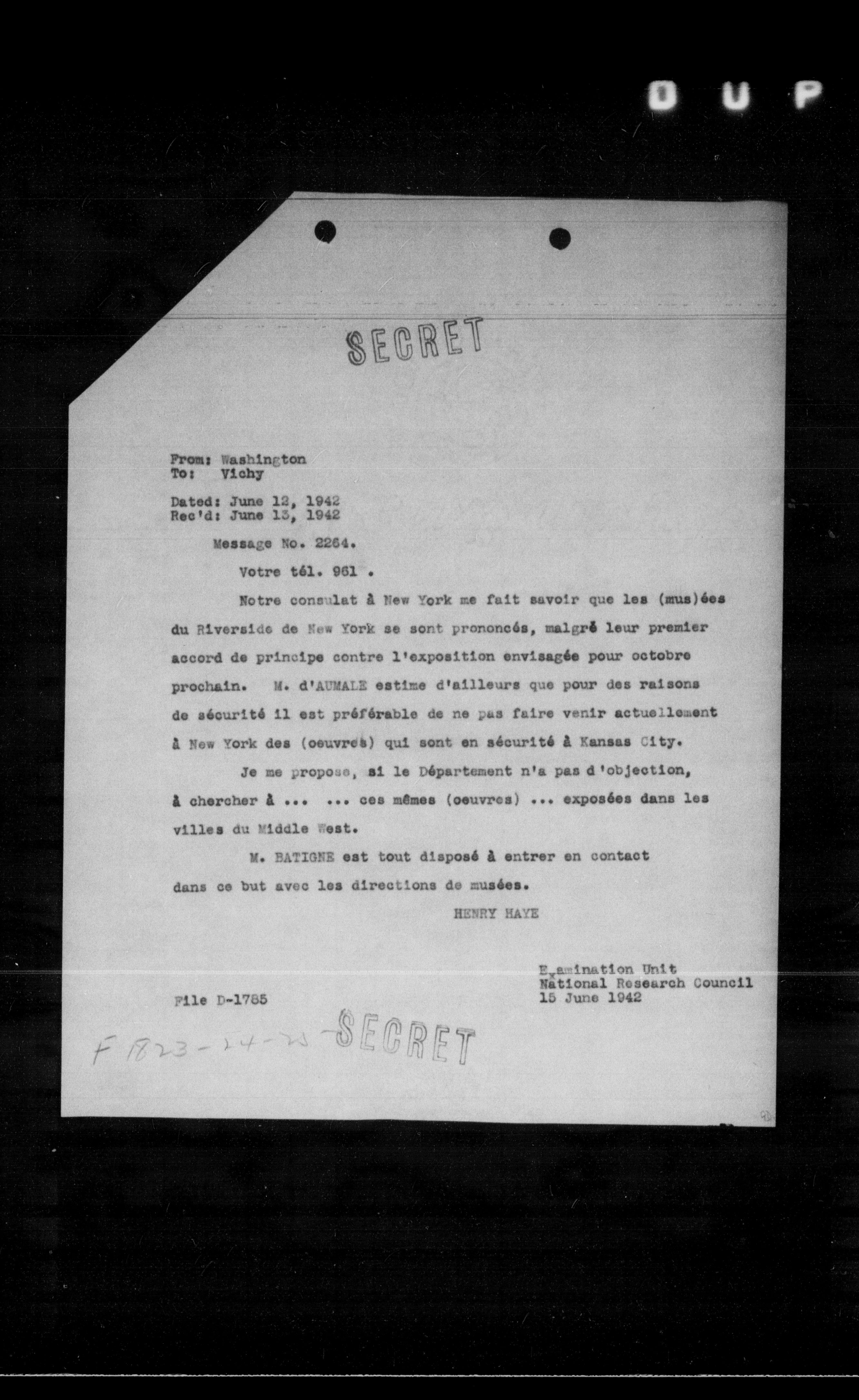 Notre consulat à New York me fait savoir que les (mus)ées du Riverside de New York se sont prononcés, malgré leur premier accord de principe contre l'exposition envisagée pour octobre prochain. M. d'AUMALE estime d'ailleurs que pour des raisons de sécurité il est préférable de ne pas faire venir actuellement à New York des (oeuvres) qui sont en sécurité à Kansas City.