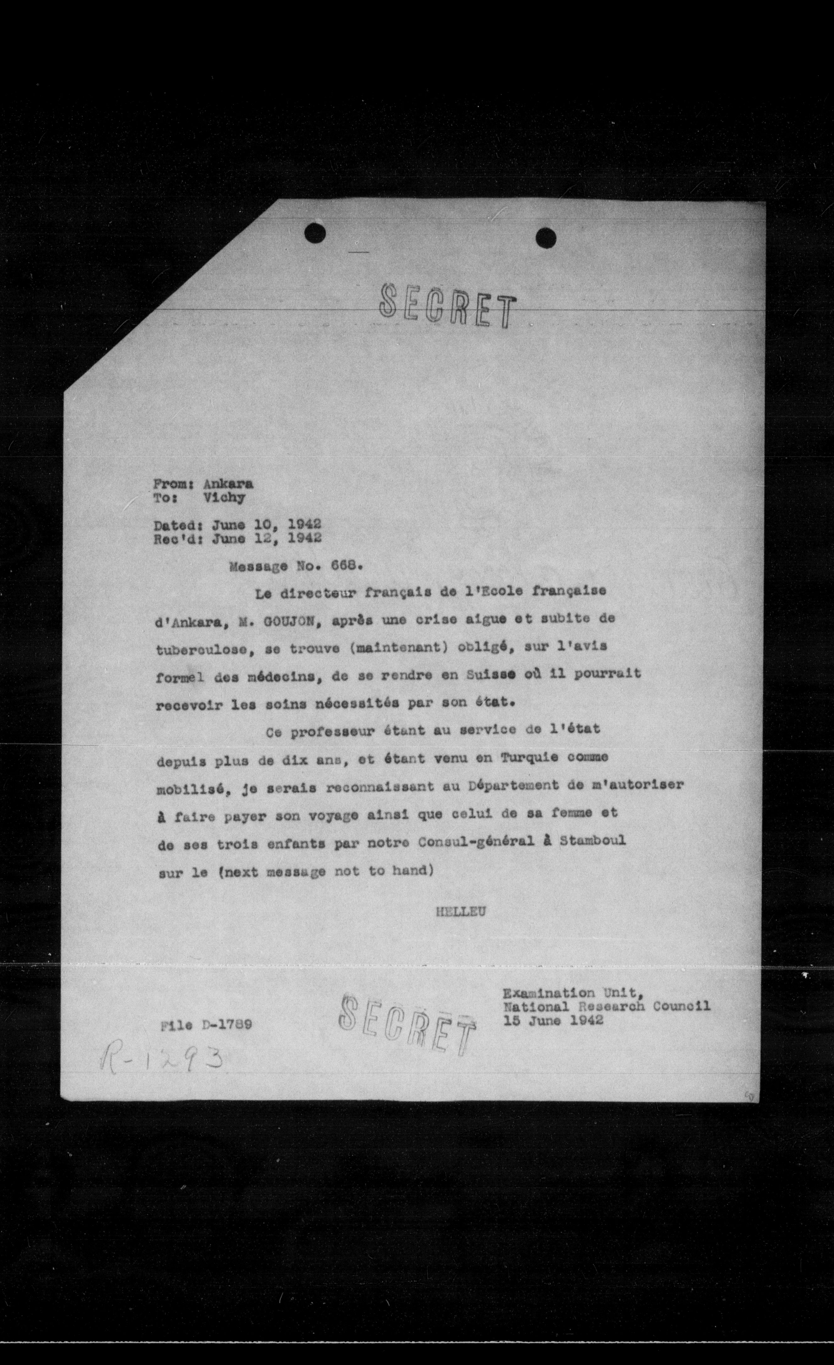 Le directeur français de l'École française d'Ankara, M. GOUJON, après une crise aigue et subite de tuberculose, se trouve (maintenant) obligé, sur l'avis formel des médecins, de se rendre en Suisse où il pourrait recevoir les soins nécessités par son état.