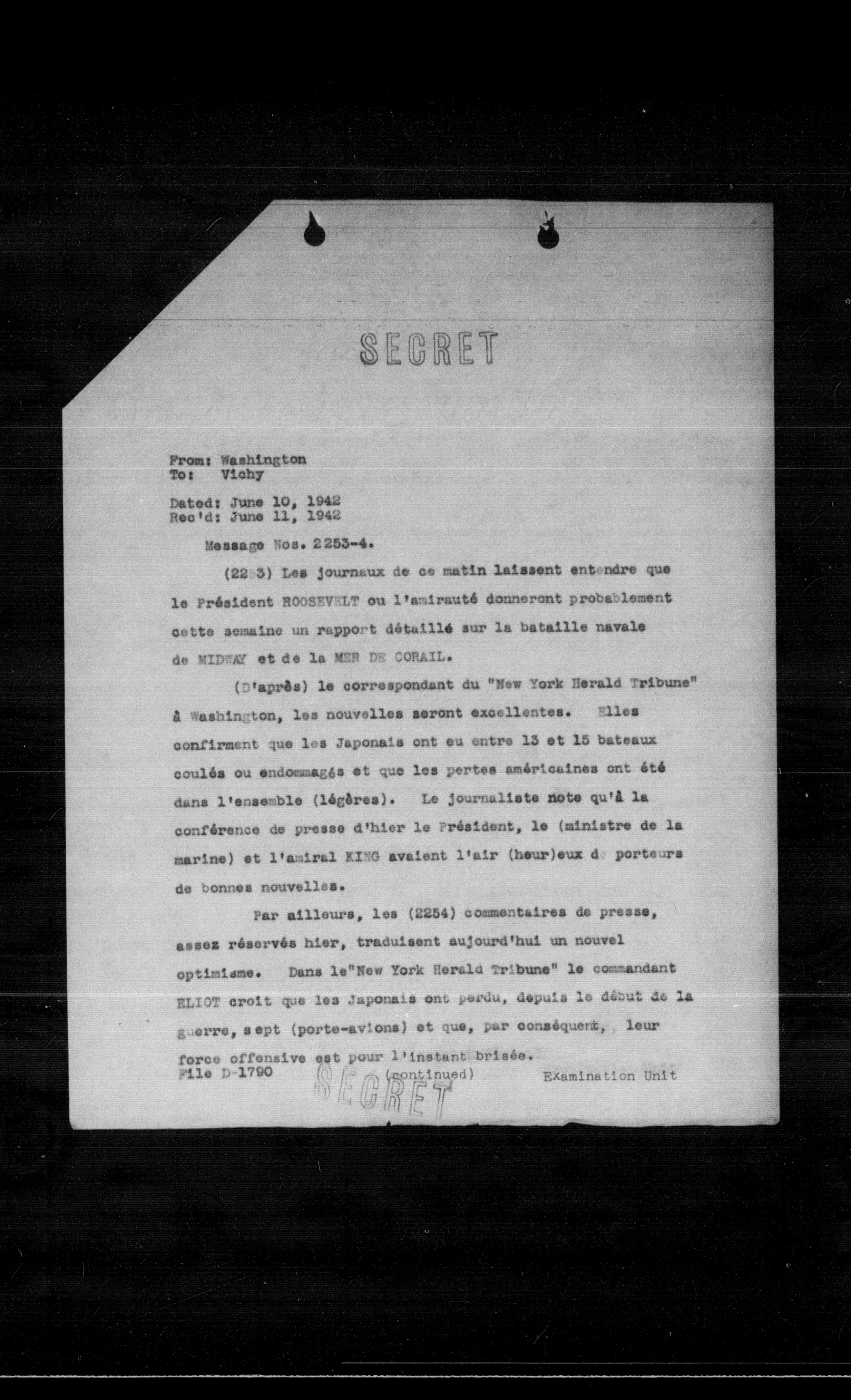 (D'après) le correspondant du "New York Herald Tribune" a Washington, les nouvelles seront excellentes. Elles confirment que les Japonais ont eu entre 13 et 15 bateaux coulés ou endommagés et que les pertes américaines ont été dans l'ensemble (légères). Le journaliste note qu'à la conférence de presse d'hier le Président, le (ministre de la marine) et l'amiral KING avaient l'air (heur) eux de porteurs de bonnes nouvelles.