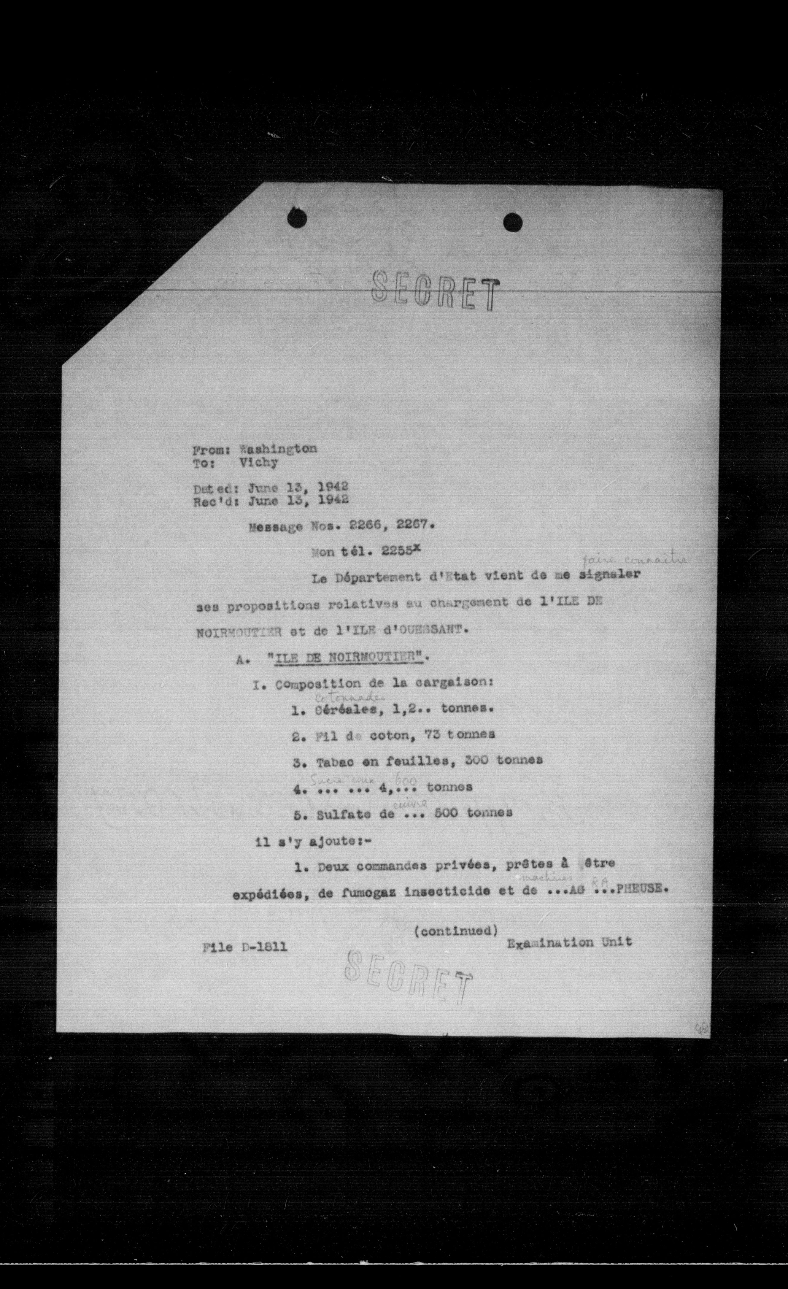 Le Département d'Etat vient de me signaler ses propositions relatives au chargement de l'ILE DE NOIRMOUTIER et de l'ILE d'OURSANT.