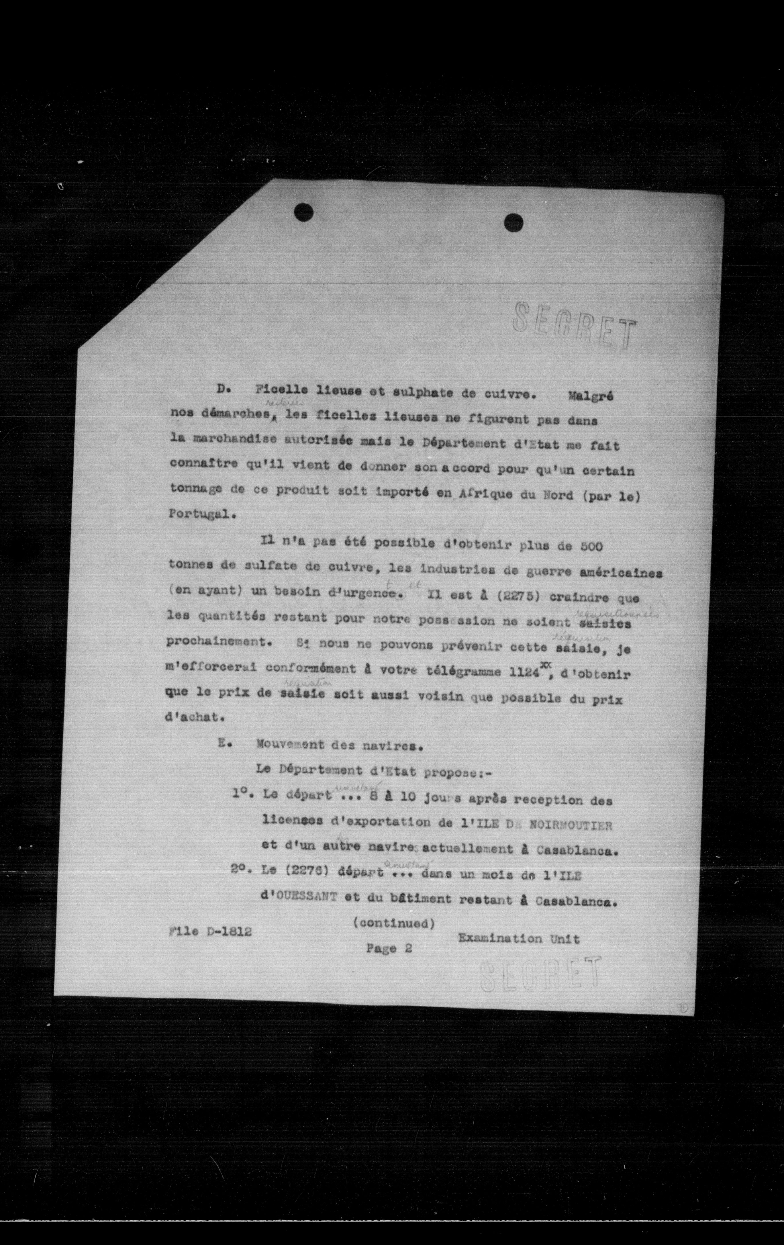 - D. **Ficelle lieuse et sulphate de cuivre.** Malgré nos démarches, les ficelles lieuses ne figurent pas dans la marchandise autorisée mais le département d'Etat me fait connaître qu'il vient de donner son accord pour qu'un certain tonnage de ce produit soit importé en Afrique du Nord (par le Portugal).