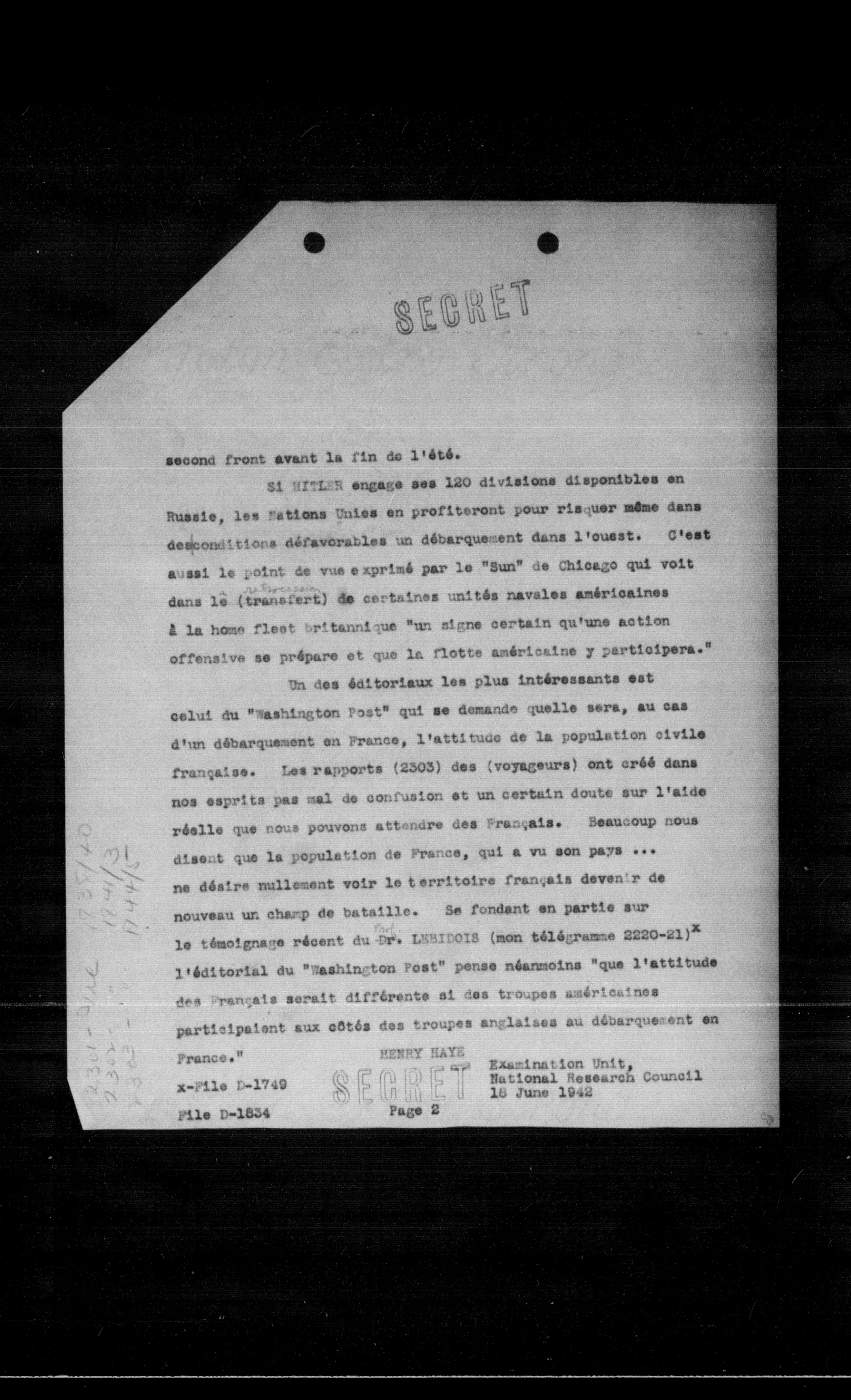 Un des éditoriaux les plus intéressants est celui du "Washington Post" qui se demande quelle sera, au cas d'un débarquement en France, l'attitude de la population civile française. Les rapports (2303) des (voyageurs) ont créé dans nos esprits pas mal de confusion et un certain doute sur l'aide réelle que nous pouvons attendre des Français. Beaucoup nous disent que la population de France, qui a vu son pays ... ne désire nullement voir le territoire français devenir de nouveau un champ de bataille. Se fondent en partie sur le témoignage récent du orr. LMBIDOIS (mon telégremme 2220-21) ${ }^{x}$ l'éditorial du "Washington Post" pense néanmoins "que l'attitude des Frangais serait différente si des troupes américaines participaient aux cotes des troupes anglaises au débarquement en France."