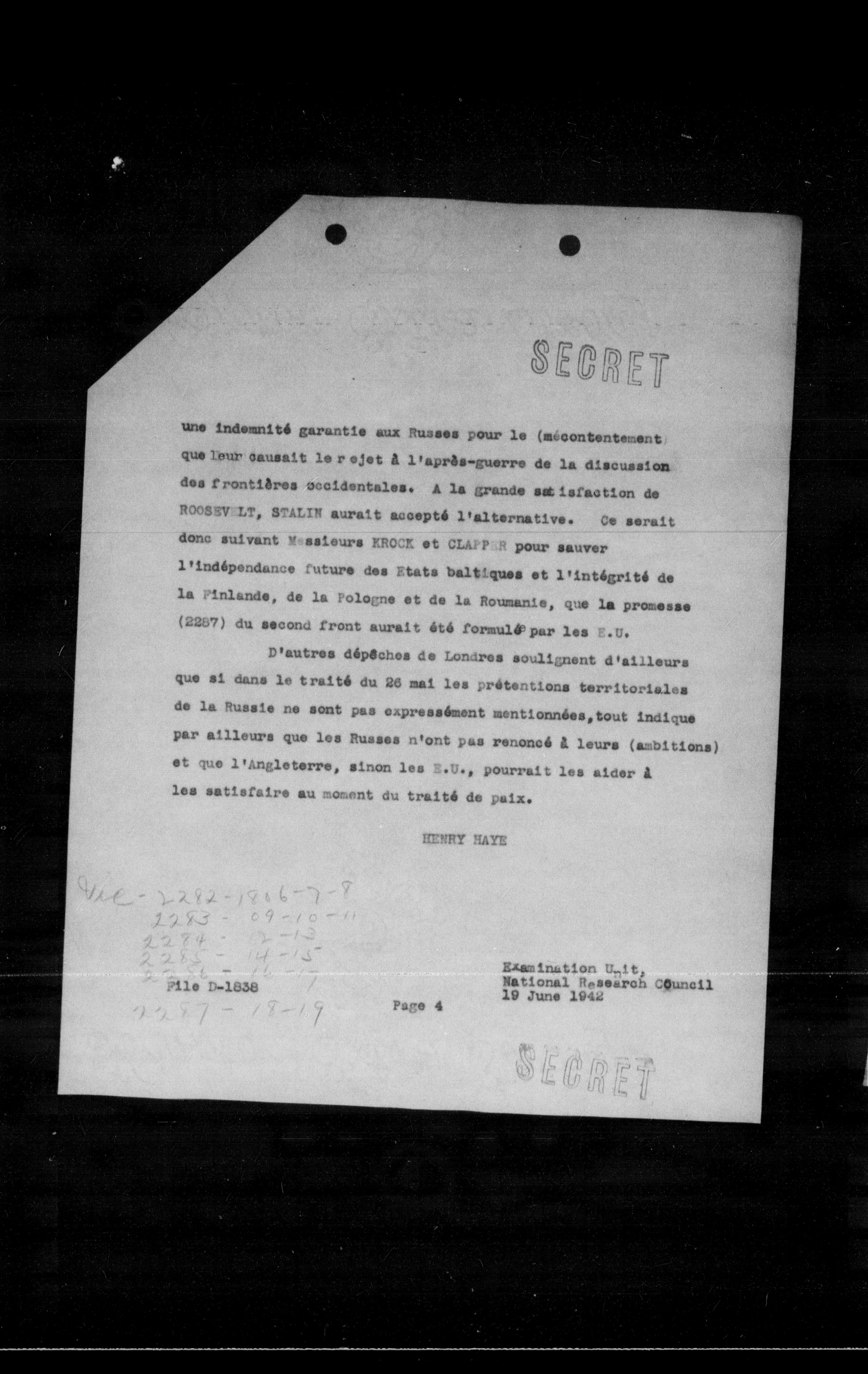 une indemnite garantie aux Russes pour le (mécontentement: que lour causait le rejet a l'après-guerre de la discussion des frontieres occidentales. A la grande satisfaction de ROOSEVELT, STALIN aurait accepté l'alternative. Ce serait donc suivant Nessleure KROCK et CLAPPEN pour sauver l'indépendance future des Etats baltiques et l'intégrité de la Pinlande, de la Pologne et de la Roumanie, que la promesse (2287) du second front aurait été formule par les E.U.