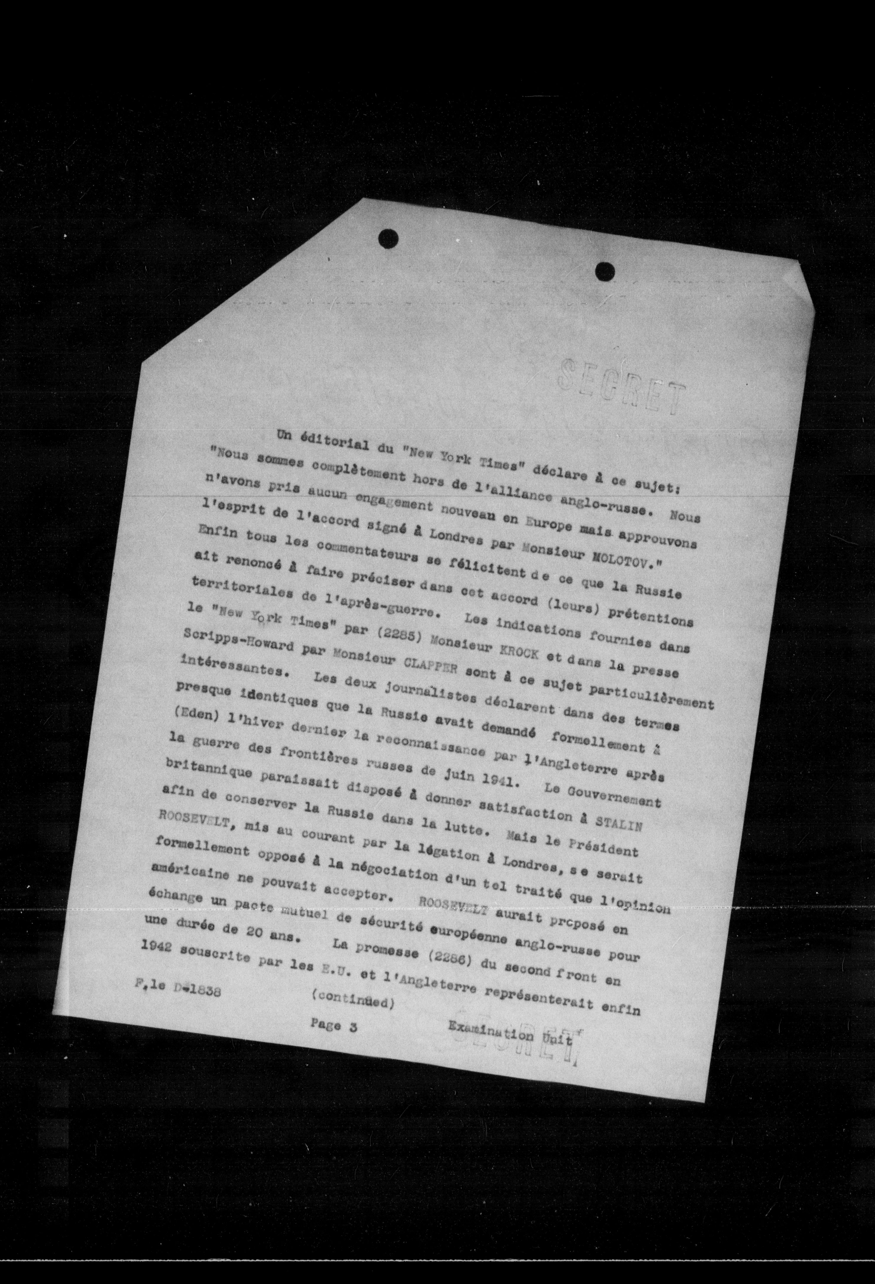 - Un éditorial du "New York Times" déclare à ce sujet: "Nous sommes complètement hors de l'alliance anglo-russe. Nous n'avons pris aucun engagement nouveau en Europe mais approuvons l'esprit de l'accord signé à Londres par Monsieur MOLOTOY." Enfin tous les commentateurs se félicitent de ce que la Russie ait renoncé à faire préciser dans cet accord (leurs) prétentions territoriales de l'après-guerre. Les indications fournies dans le "New York Times" par (2285) Monsieur KROCK et dans la presse Scripps-Howard par Monsieur CLAPPEN sont à ce sujet particulièrement intéressantes. Les deux journalistes déclarent dans des termes presque identiques que la Russie avait demandé formellement à (Eden) l'hiver dernier la reconnaissance par l'Angleterre après la guerre des frontières russes de juin 1941. Le Gouvernement britannique paraissait disposé à donner satisfaction à STALIN afin de conserver la Russie dans la lutte. Mais le Président ROOSEVELT, mis au courant par la légation à Londres, se serait formellement opposé à la négociation d'un tel traité que l'opinion américaine ne pouvait accepter. ROOSEVELT aurait proposé en échange un pacte mutuel de sécurité européenne anglo-russe pour une durée de 20 ans. La promesse (2286) du second front en 1942 souscrite par les E.U. et l'Angleterre représenteraít enfin F,le D41838