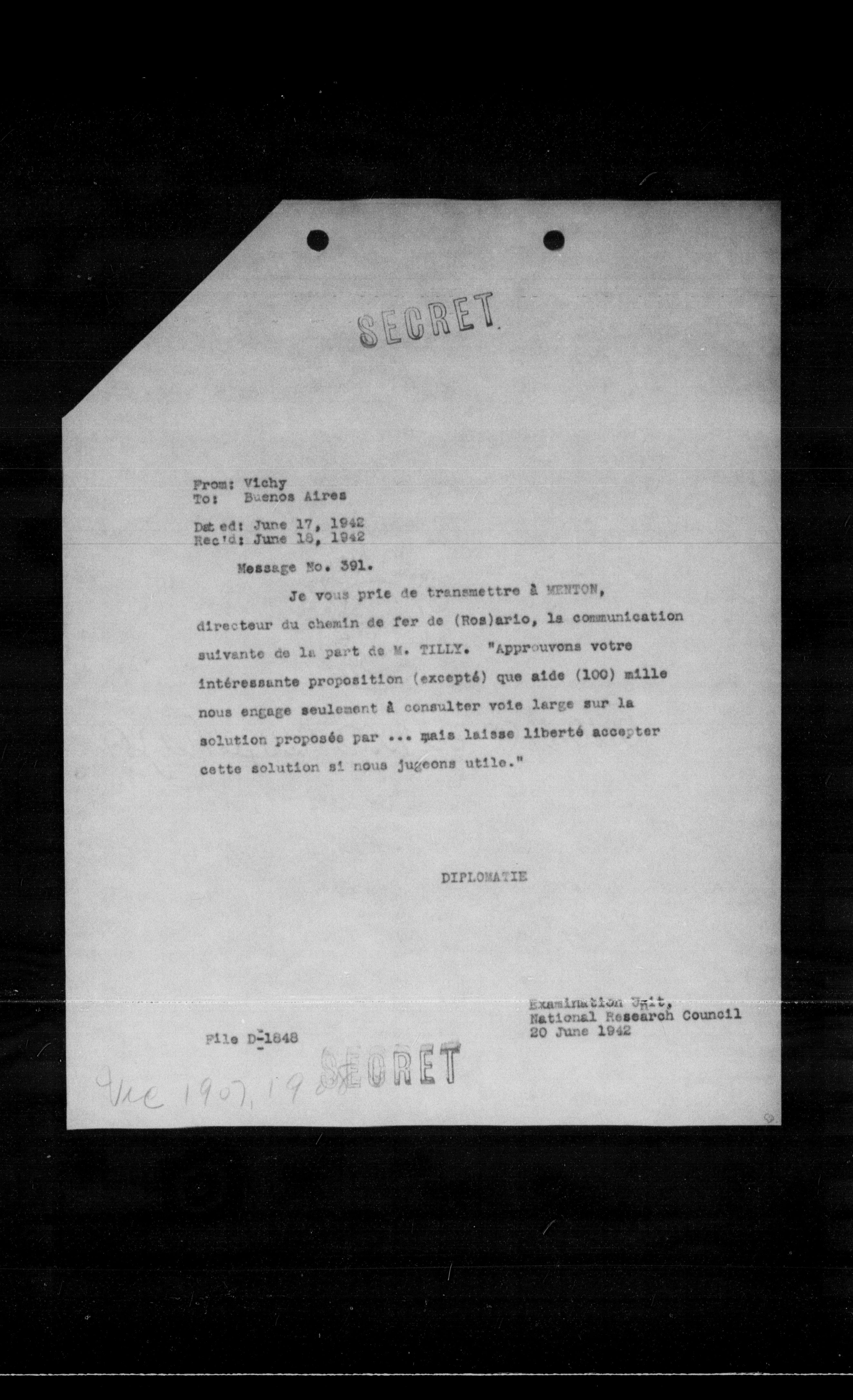 Je vous prie de transmettre à MENTON, directeur du chemin de fer de (Ros)ario, la communication suivante de la part de M. TILLY. "Approuvons votre intéressante proposition (excepté) que aide (100) mille nous engage seulement à consulter votre large sur la solution proposée par ... mais laisse liberté accepter cette solution si nous jugeons utile."