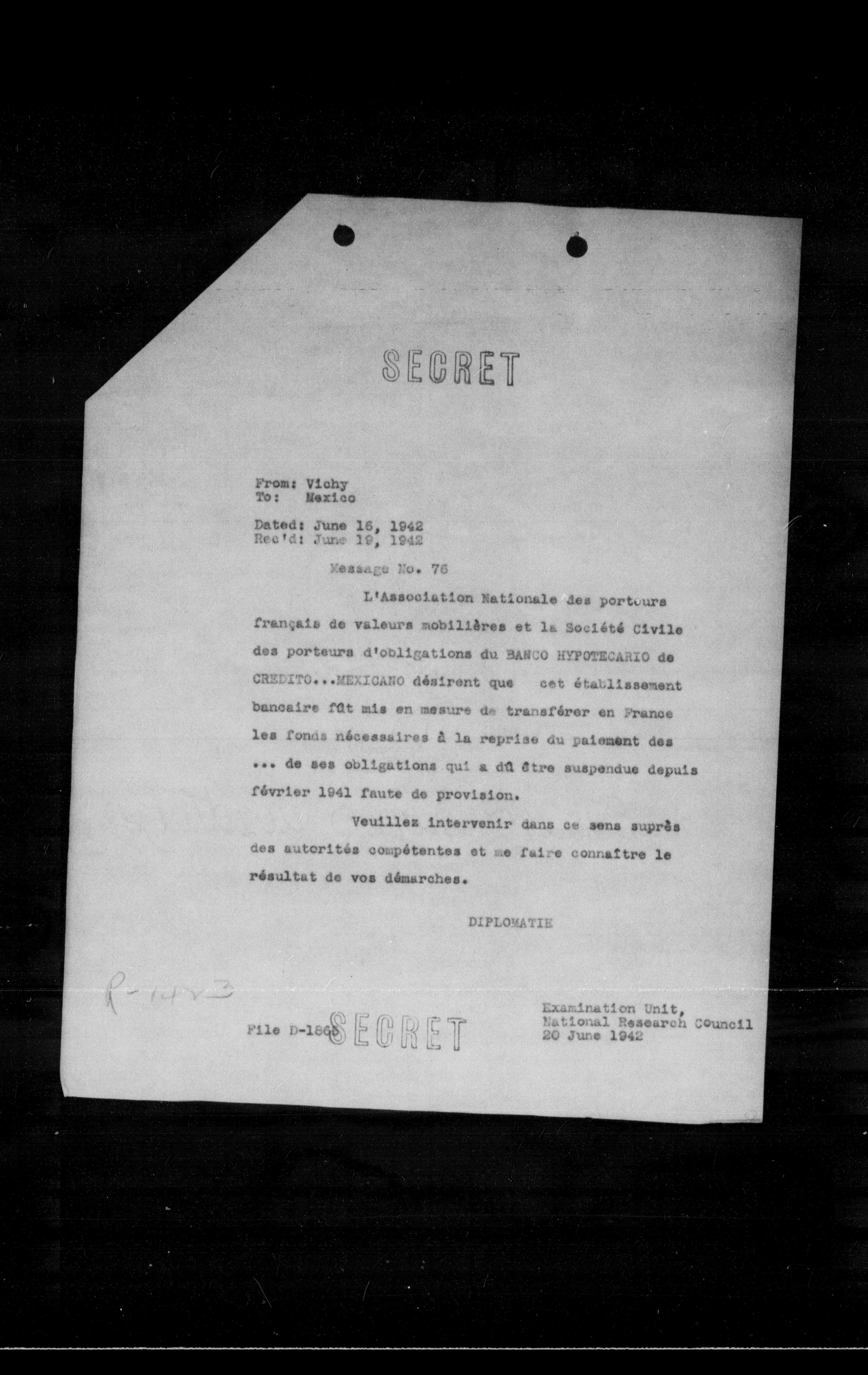 français de valeurs mobilières et la Société Civile des porteurs d'obligations du BANCO HYPOTECARIO de CREDIT0...MEXICANO désirent que cet établissement bancaire fut mis en mesure de transférer en France les fonds nécessaires à la reprise du paiement des ... de ses obligations qui a da être suspendue depuis février 1941 faute de provision.
