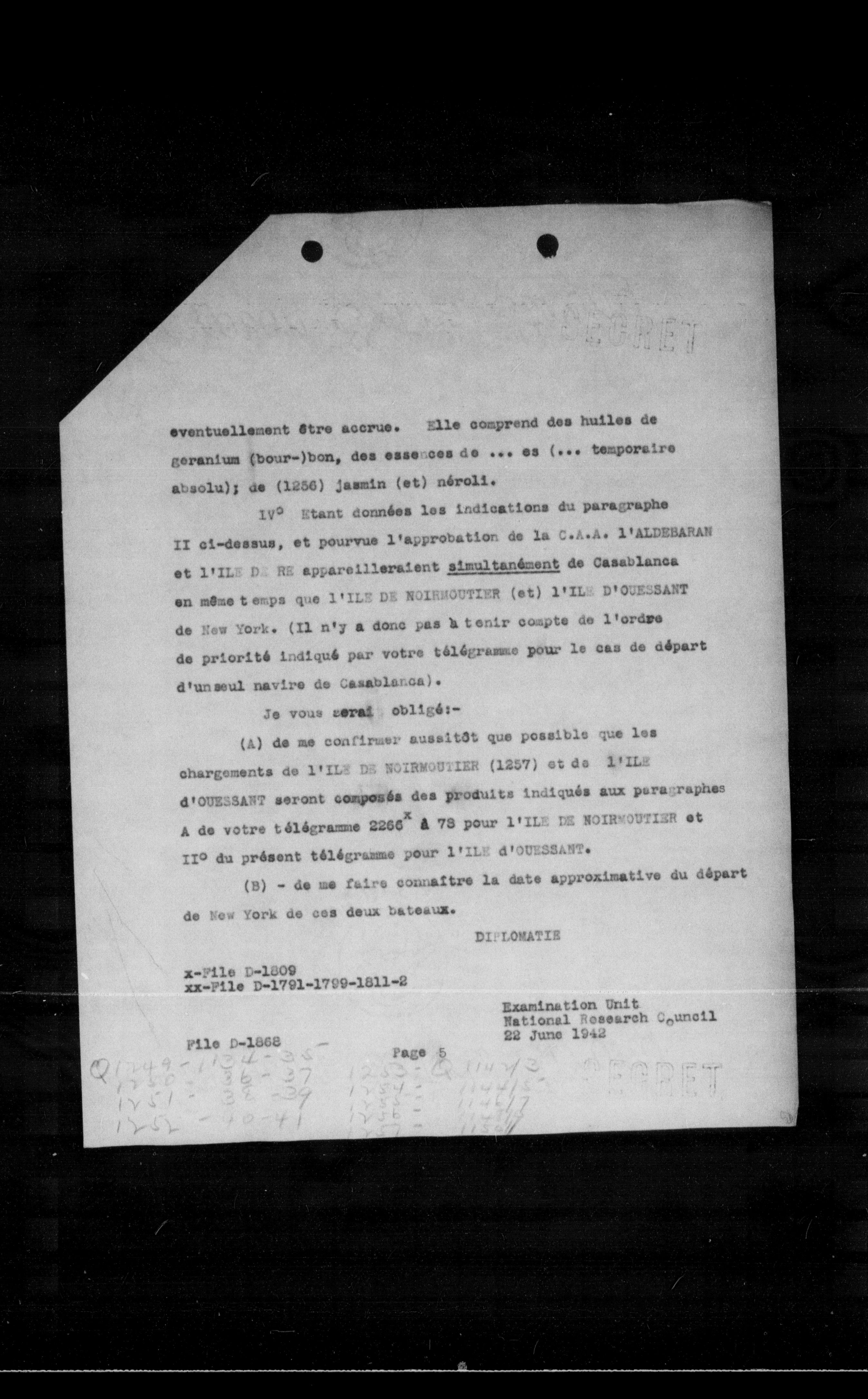 IVe étant données les indications du paragraphe II ci-dessus, et pourvue l'approbation de la C.A.A. l'ALDEBARAN et l'ILE DE RE appareilleraient simultanément de Casablanca en même temps que l'ILE DE NOIRMOUTIER (et) l'ILE D'OUESSANT de New York. (Il n'y a donc pas à tenir compte de l'ordre de priorité indiqué par votre télégramme pour le cas de départ d'un seul navire de Casablanca).