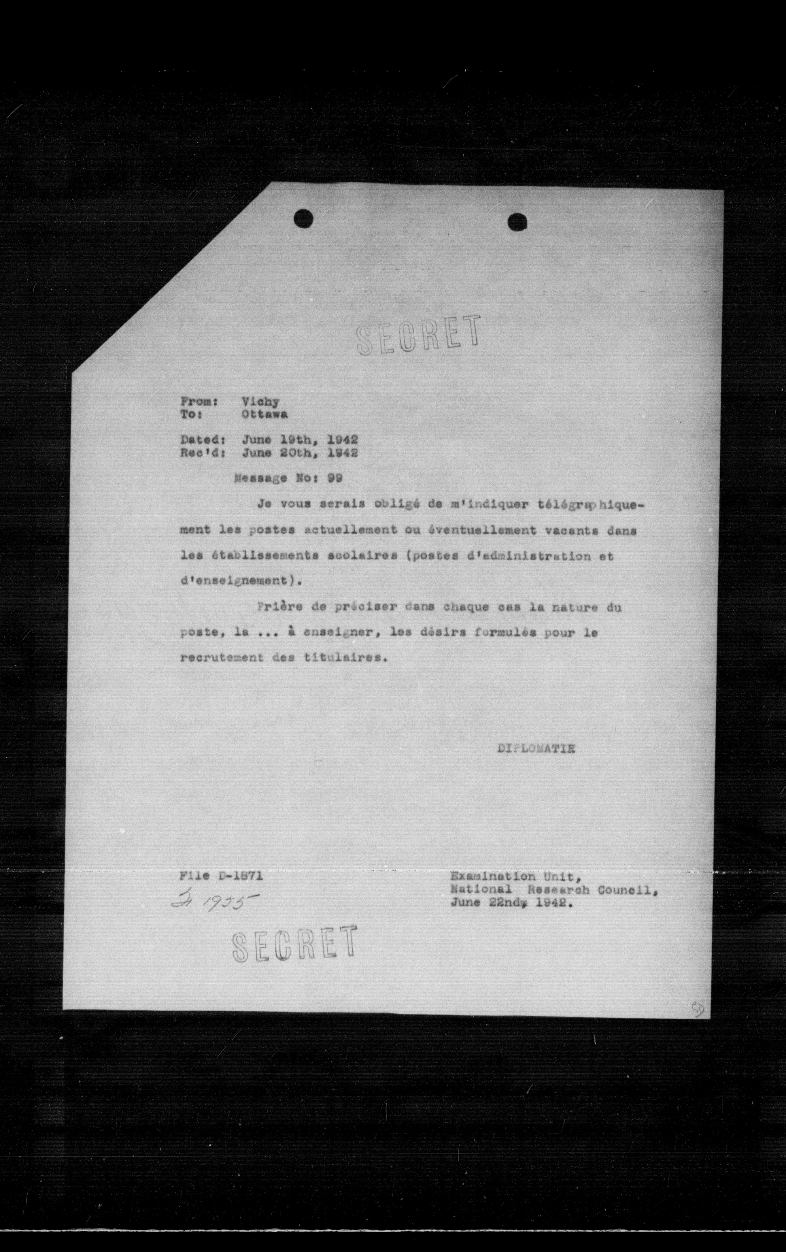 **Examination Unit, National Research Council, June 22nd, 1942.**