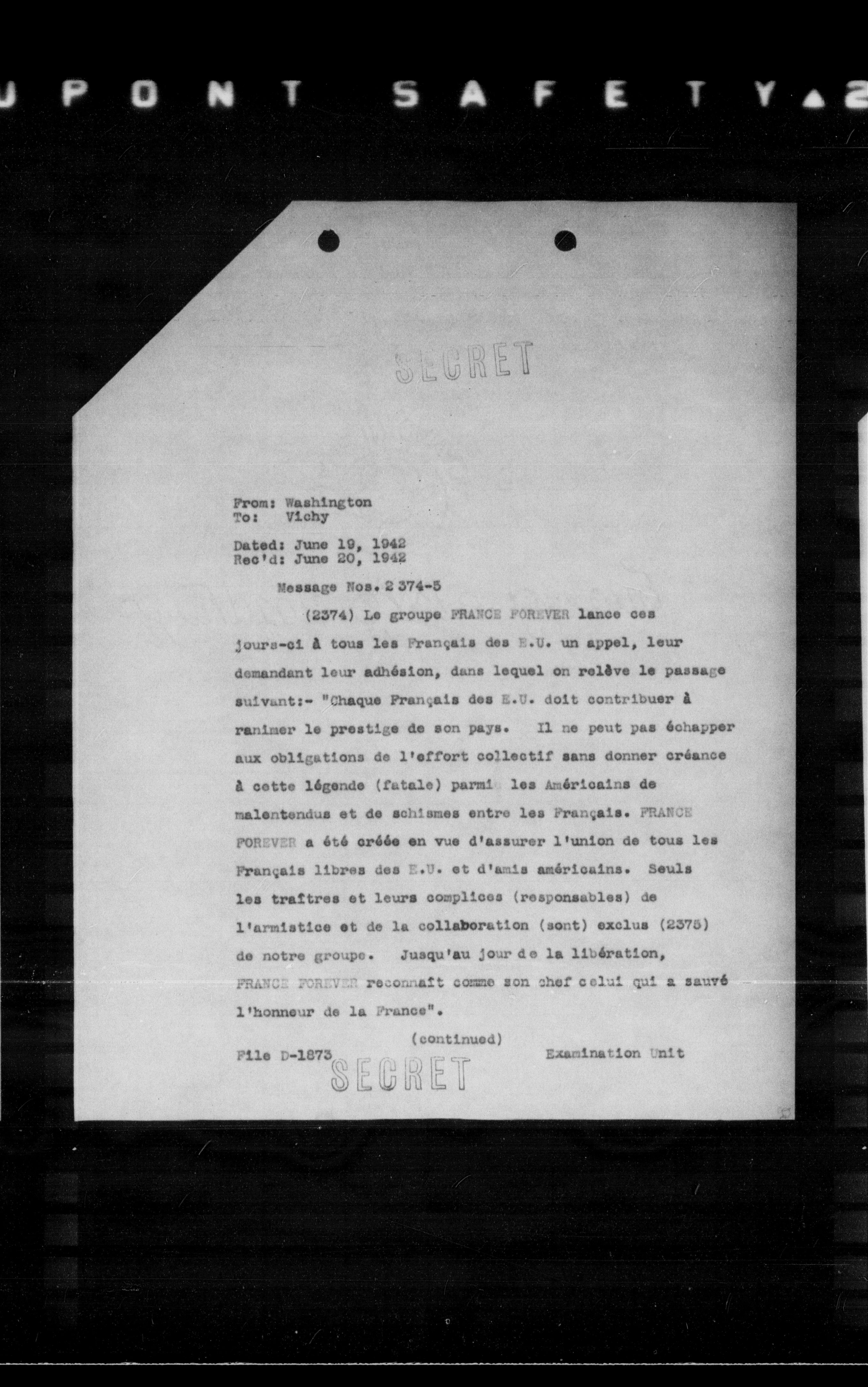 (2374) Le groupe FRANCE FOREVER lance ces jours-ci à tous les Français des E.U. un appel, leur demandant leur adhésion, dans lequel on relève le passage suivant: "Chaque Français des E.U. doit contribuer à ranimer le prestige de son pays. Il ne peut pas échapper aux obligations de l'effort collectif sans donner créance à cette légende (fatale) parmi les Américains de malentendus et de schismes entre les Français. FRANCE FOREVER a été créée en vue d'assurer l'union de tous les Français libres des E.U. et d'amis américains. Seuls les traîtres et leurs complices (responsables) de l'armistice et de la collaboration (sont) exclus (2375) de notre groupe. Jusqu'au jour de la libération, FRANCE FOREVER reconnaît comme son chef celui qui a sauvé l'honneur de la France".