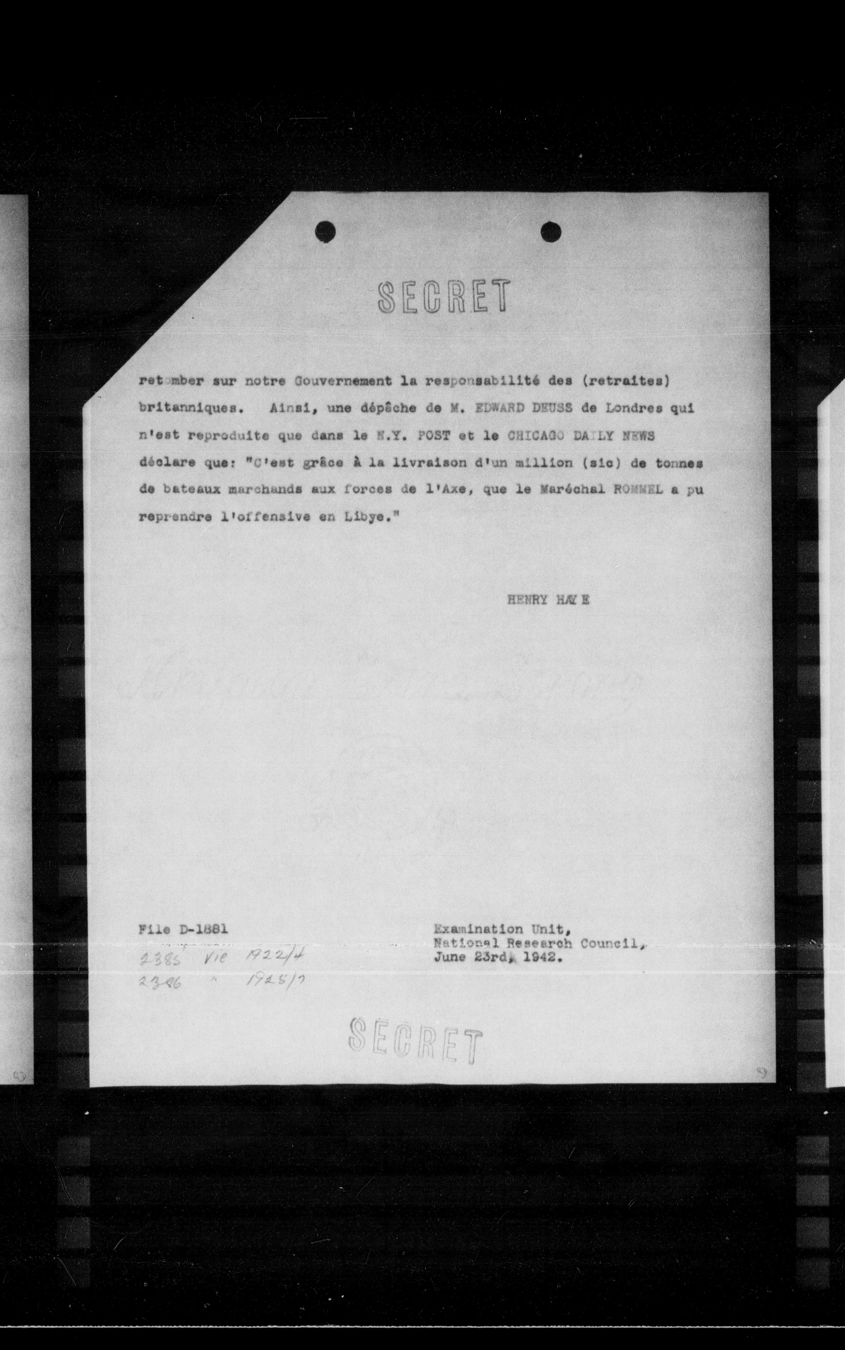 retmber sur notre Gouvernement la responsabilité des (retraites) britanniques. Ainsi, une dépêche de M. EDWARD DEUSS de Londres qui n'est reproduite que dans le N.Y. POST et le CHICAGO DA:LY NEWS déclare que: "C'est grêce à la livraison d'un million (sic) de tomnes de bateaux marchands aux forces de l'Axe, que le Maréchal NOMMEL a pu reprendre l'offensive en Libye."