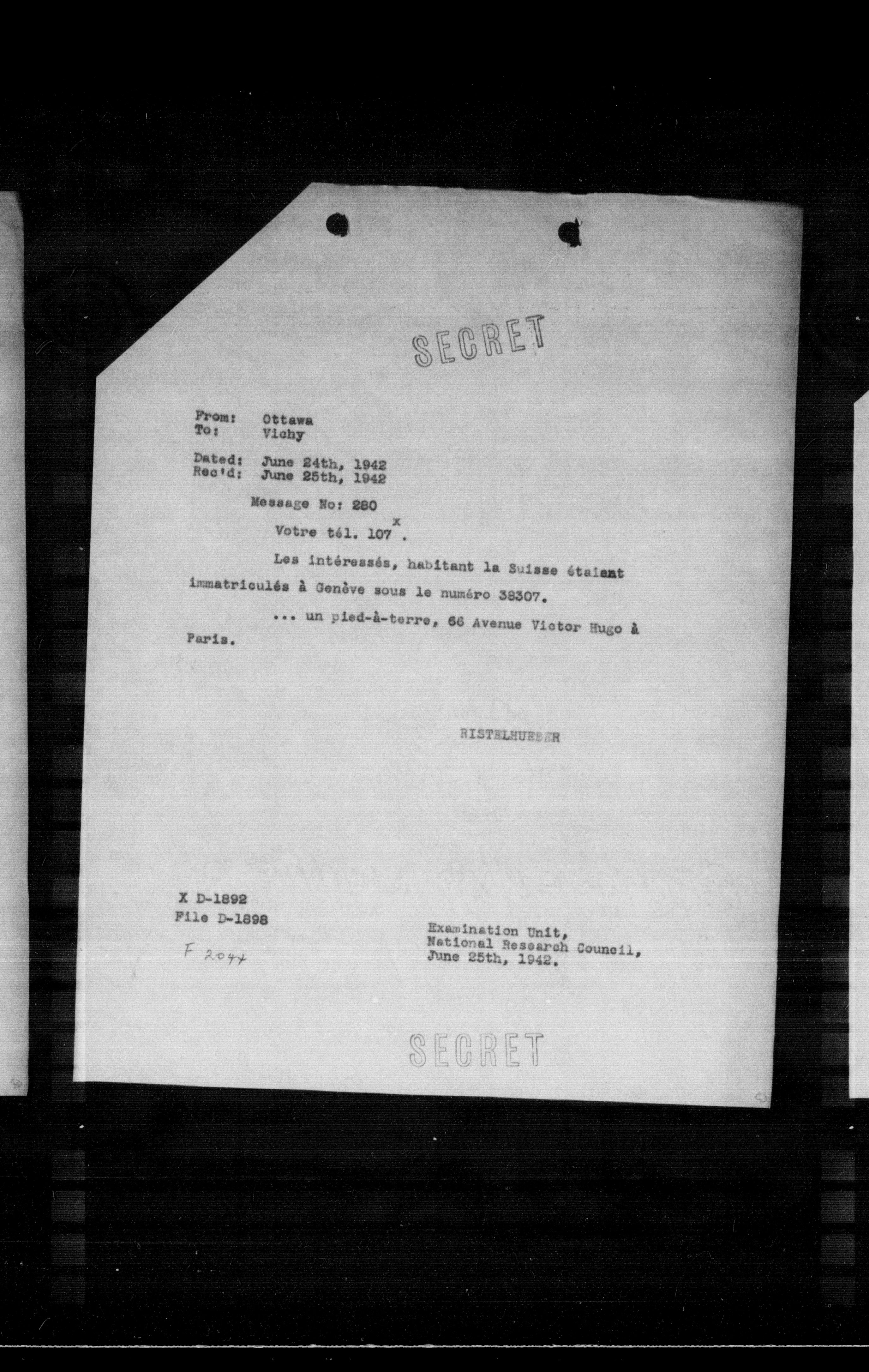 **From:** Ottawa **To:** Vichy **Dated:** June 24th, 1942 **Rec'd:** June 25th, 1942 **Message No:** 280 **Votre tél. 107°.**