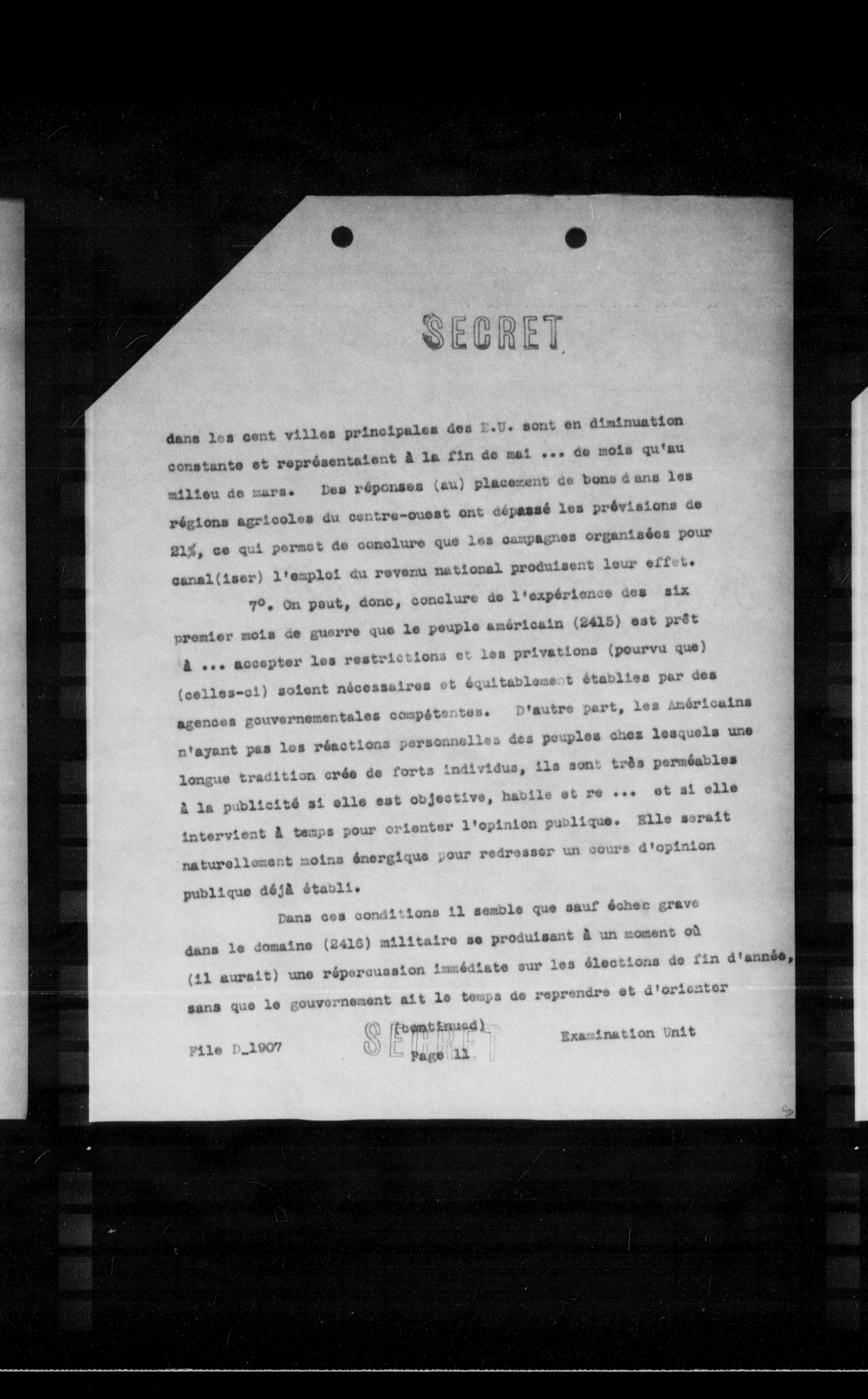 $7^{\circ}$. On peut, donc, conclure de l'expérience des six premier mois de guerre que le peuple américain (2415) est prêt a ... accepter les restrictions et les privations (pourvu que) (celles-ci) soient nécessaires et équitableme:t établies par des agences gouvernementales compétentes. D'autre part, les anéricains n'ayant pas les réactions personnelles des peuples chez lesquels une longue tradition crée de forts individus, ils sont très perméables a la publicité si elle est objective, habile et re ... et si elle intervient a temps pour orienter l'opinion publique. Elle serait naturellement moins énergique pour redresser un cours d'opinion publique déja établi.