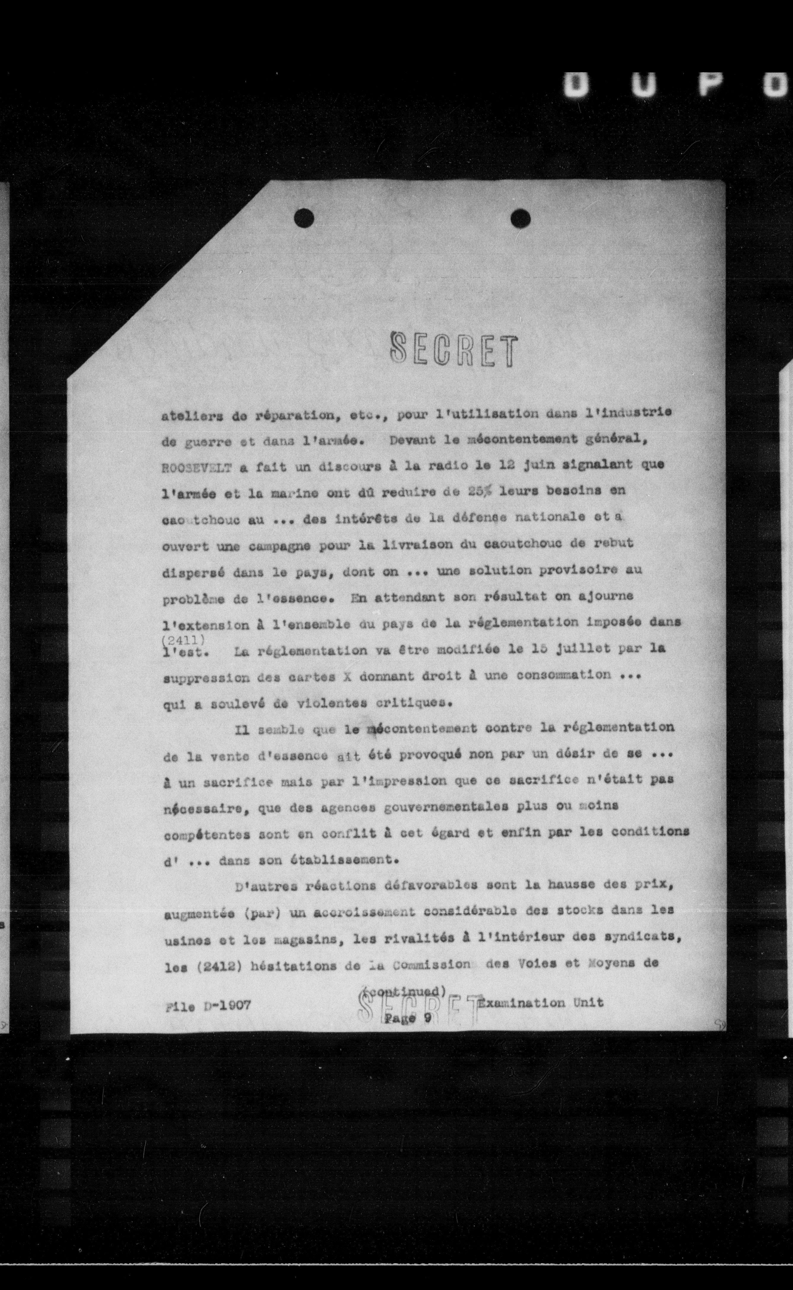 ateliers de réparation, etc., pour l'utilisation dans l'industrie de guerre et dans l'armée. Devant le mécontentement général, BOOSEVELT a fait un discours a la radio le 12 juin signalant que l'armée et la marine ont da reduire de $25 \%$ leurs besoins en caoutchouc au ... des intérêts de la défense nationale et a ouvert une campagne pour la livraison du caoutchouc de rebut dispersé dans le pays, dont on ... une solution provisoire au problème de l'essence. En attendant son résultat on ajourne l'extension a l'ensemble du pays de la réglementation imposée dans 1'est. La réglementation va être modifiée le 15 juillet par la suppression des cartes $X$ donnant droit a une consommation ... qui a soulevé de violentes critiques.