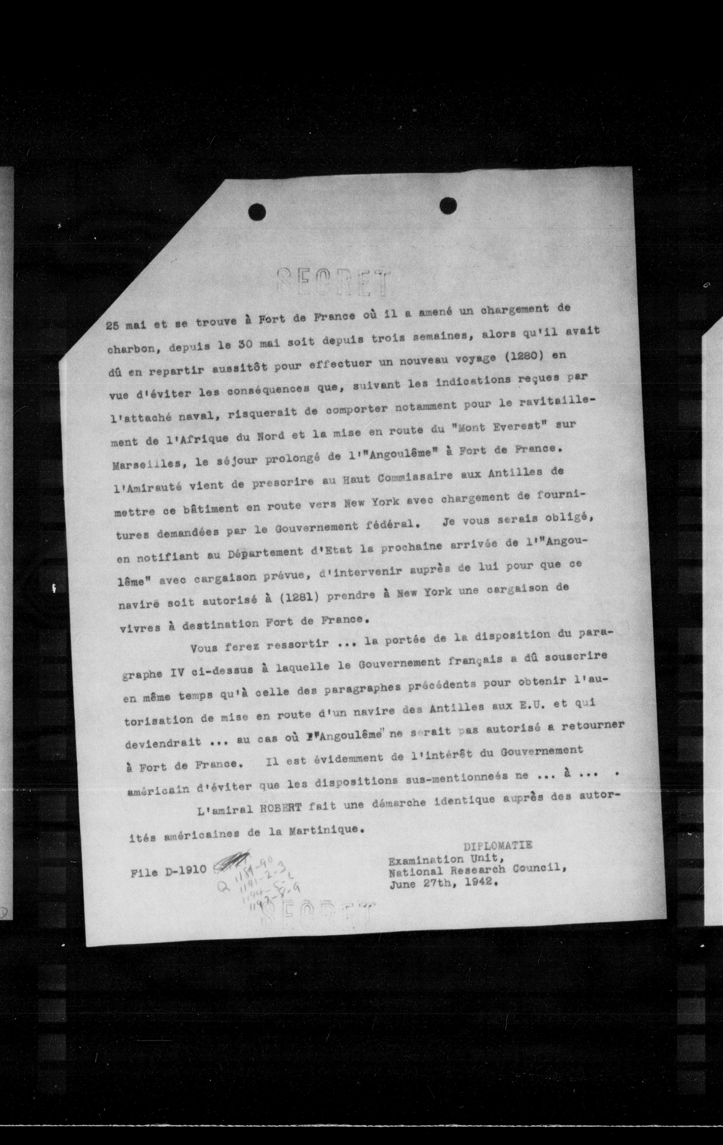 - 25 mai et se trouve a Fort de France où il a amené un chargement de charbon, depuis le 30 mai soit depuis trois semaines, alors qu'il avait dû en repartir aussitôt pour effectuer un nouveau voyage (1280) en vue d'éviter les conséquences que, suivant les indications reçues par l'attaché naval, risquerait de comporter notamment pour le ravitaillement de l'Afrique du Nord et la mise en route du "Mont Everest" sur Marseilles, le séjour prolongé de l'"Angoulême" a Fort de France. l'Amirauté vient de prescrire au Haut Commissaire aux Antilles de mettre ce bâtiment en route vers New York avec chargement de fournitures demandées par le Gouvernement fédéral. Je vous serais obligé, en notifiant au Département d'Etat la prochaine arrivée de l'"Angoulême" avec cargaison prévue, d'intervenir auprès de lui pour que ce navire soit autorisé à (1281) prendre à New York une cargaison de vivres à destination Fort de France.