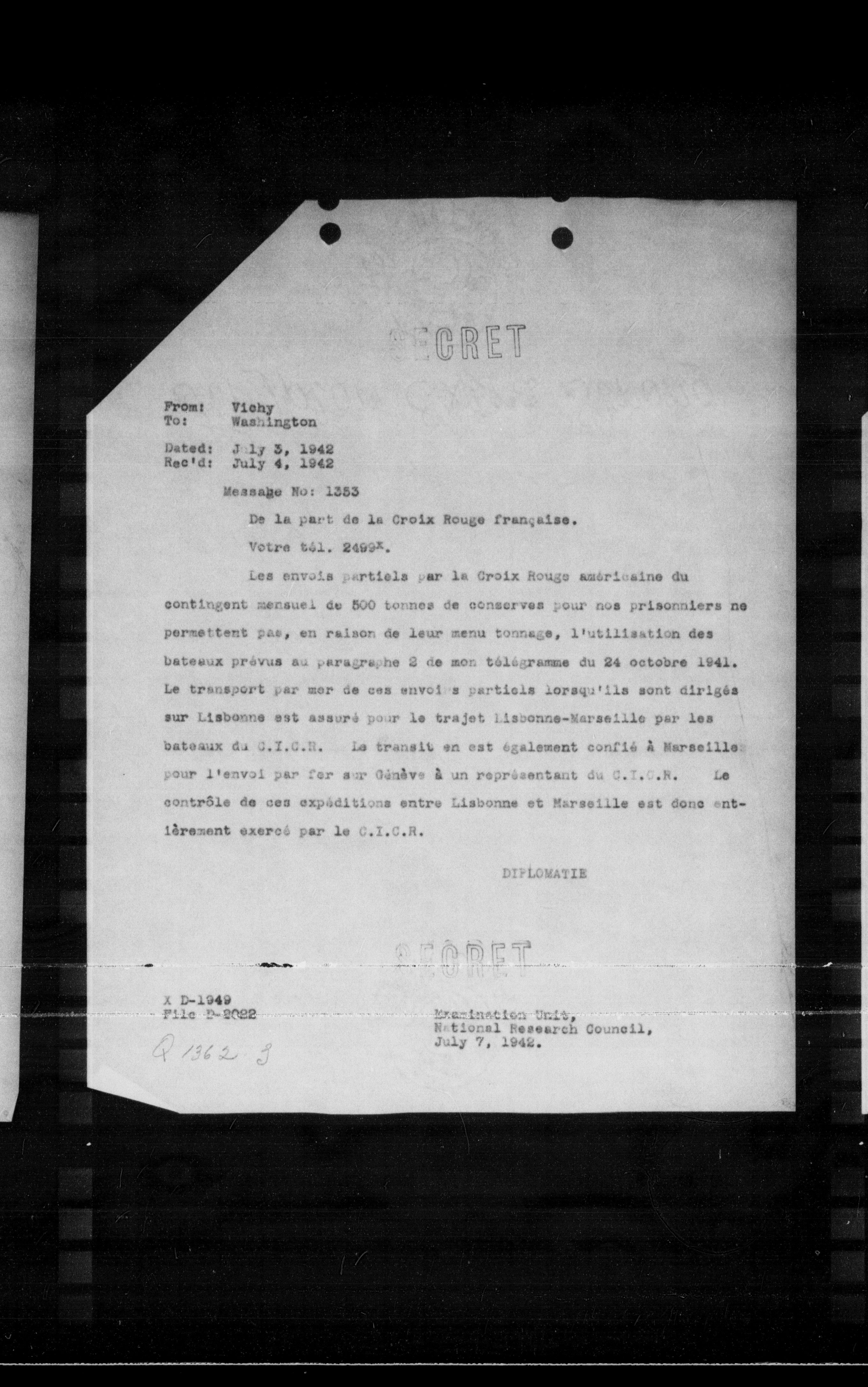Les envols partiels par la Croix Rouge américaine du contingent mensuel de 500 tonnes de conserves pour nos prisonniers ne permettent pas, en raison de leur menu tonnage, l'utilisation des bateaux prévus au paragraphe 2 de mon téléphone du 24 octobre 1941. Le transport par mer de ces envols partiels lorsqu'ils sont dirigés sur Lisbonne est assuré pour le trajet Lisbonne-Marseille par les bateaux du C.I.C.R. Le transit en est également confié à Marseille pour l'envoi par fer sur Genève à un représentant du C.I.C.R. Le contrôle de ces expéditions entre Lisbonne et Marseille est donc entièrement exercé par le C.I.C.R.