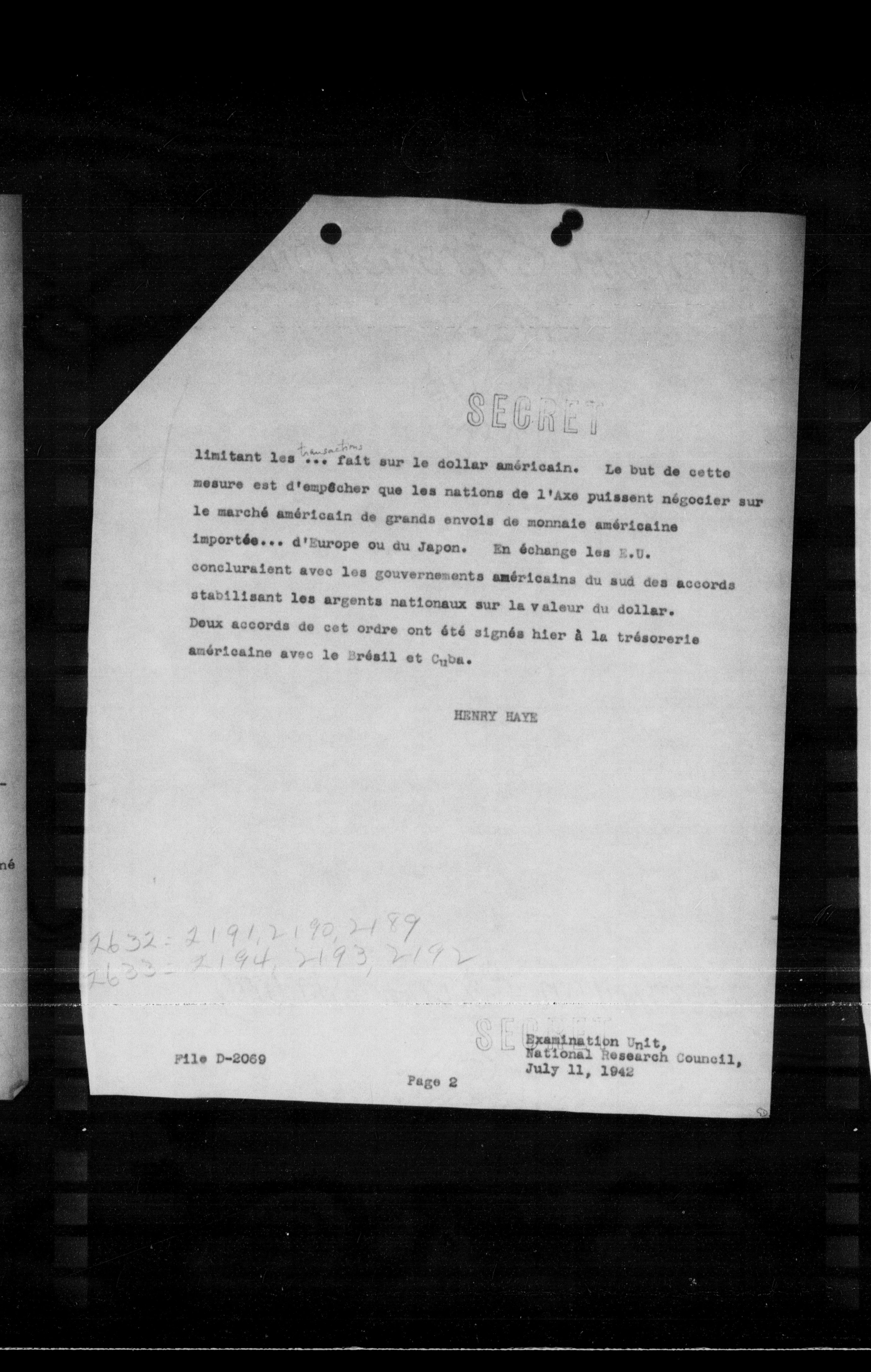 limitant les ... fait sur le dollar américain. Le but de cette mesure est d'empêcher que les nations de l'Axe puissent négocier sur le marché américain de grands envois de monnaie américaine importée... d'Europe ou du Japon. En échange les E.U. concluraient avec les gouvernements américains du sud des accords stabilisant les argents nationaux sur la valeur du dollar. Deux accords de cet ordre ont été signés hier a la trésorerie américaine avec le Brésil et Cuba.
