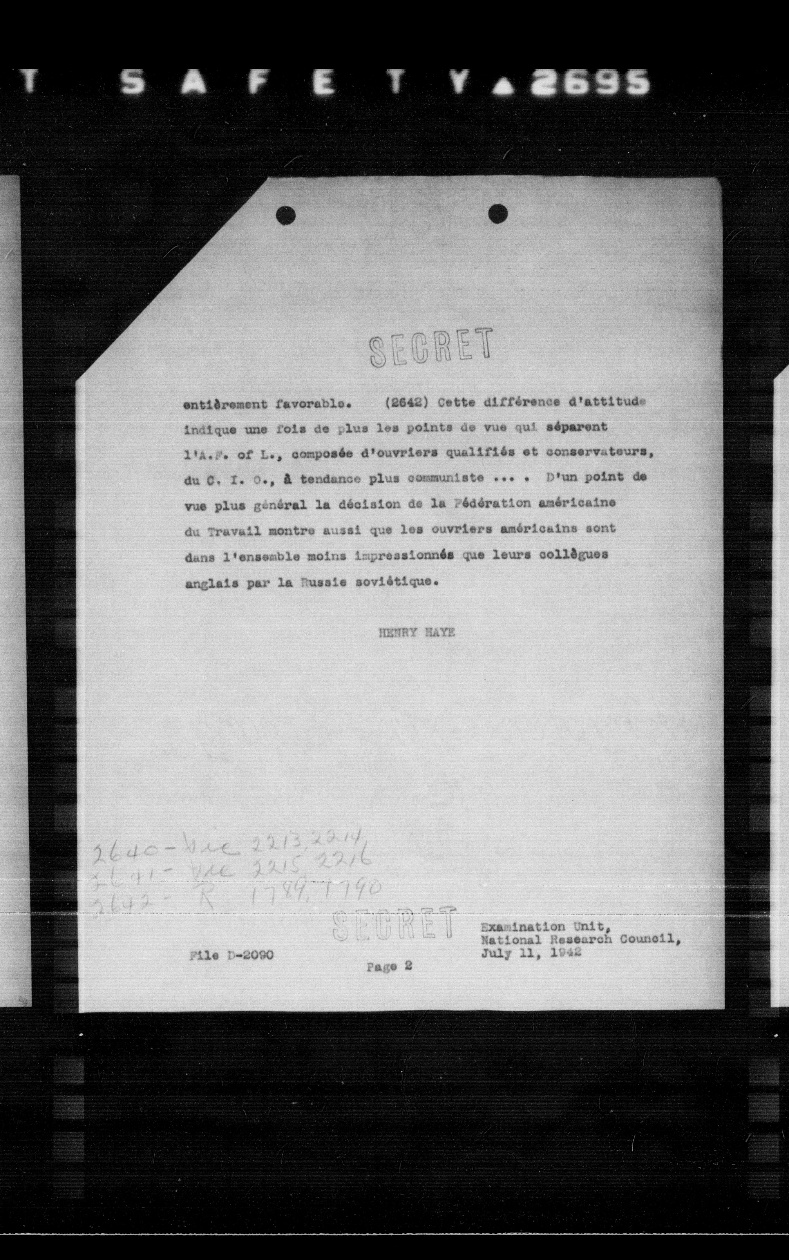 entièrement favorable. (2642) Cette différence d'attitude indique une fois de plus les points de vue qui séparent l'A.F. of L., composée d'ouvriers qualifiés et conservateurs, du S. I. O., à tendance plus communiste ... . D'un point de vue plus général la décision de la Fédération américaine du Travail montre aussi que les ouvriers américains sont dans l'ensemble moins impressionnés que leurs collègues anglais par la Russie soviétique.