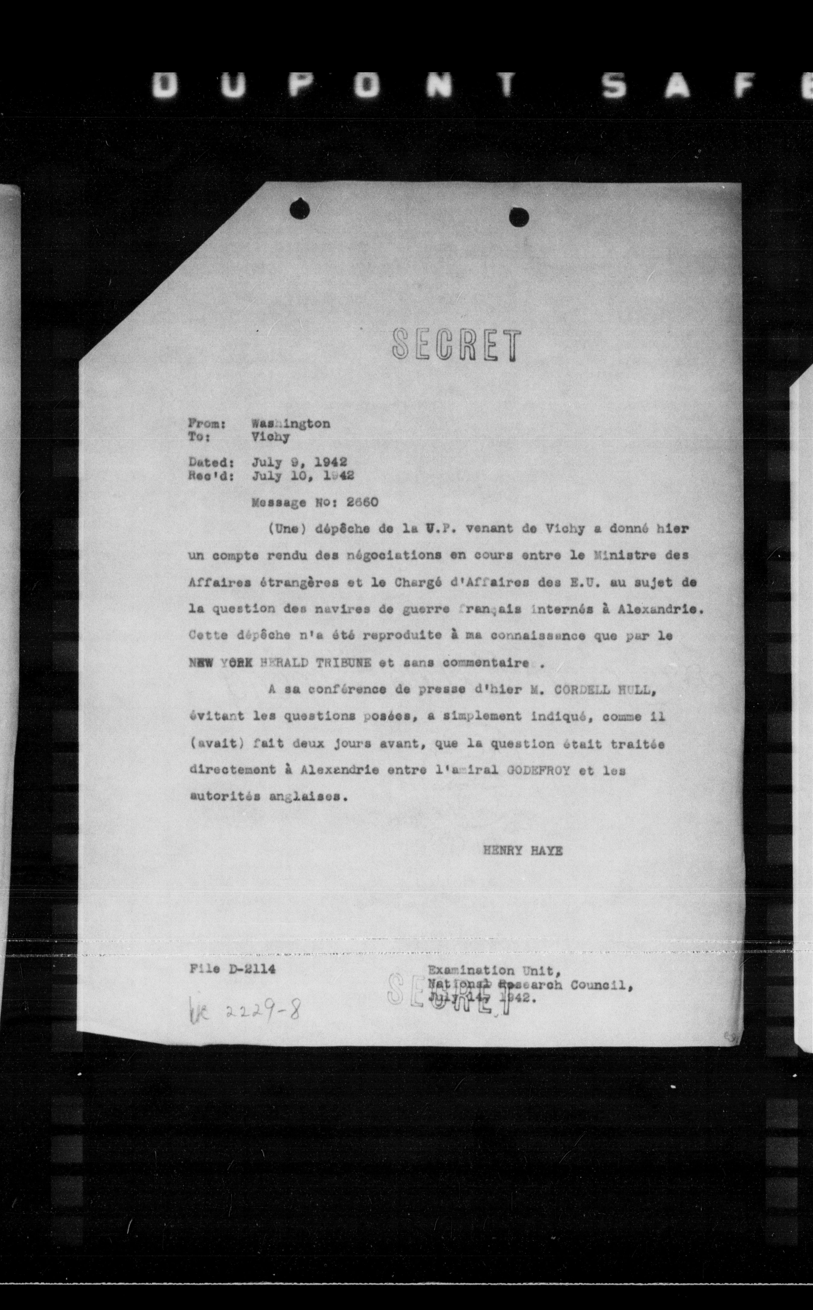 (Une) dépêche de la U.P. venant de Vichy a donné hier un compte rendu des négociations en cours entre le Ministre des Affaires étrangères et le Chargé d'Affaires des E.U. au sujet de la question des navires de guerre français internés à Alexandrie. Cette dépêche n'a été reproduite à ma connaissance que par le NNN YORK HERALD THISUNE et sans commentaire.