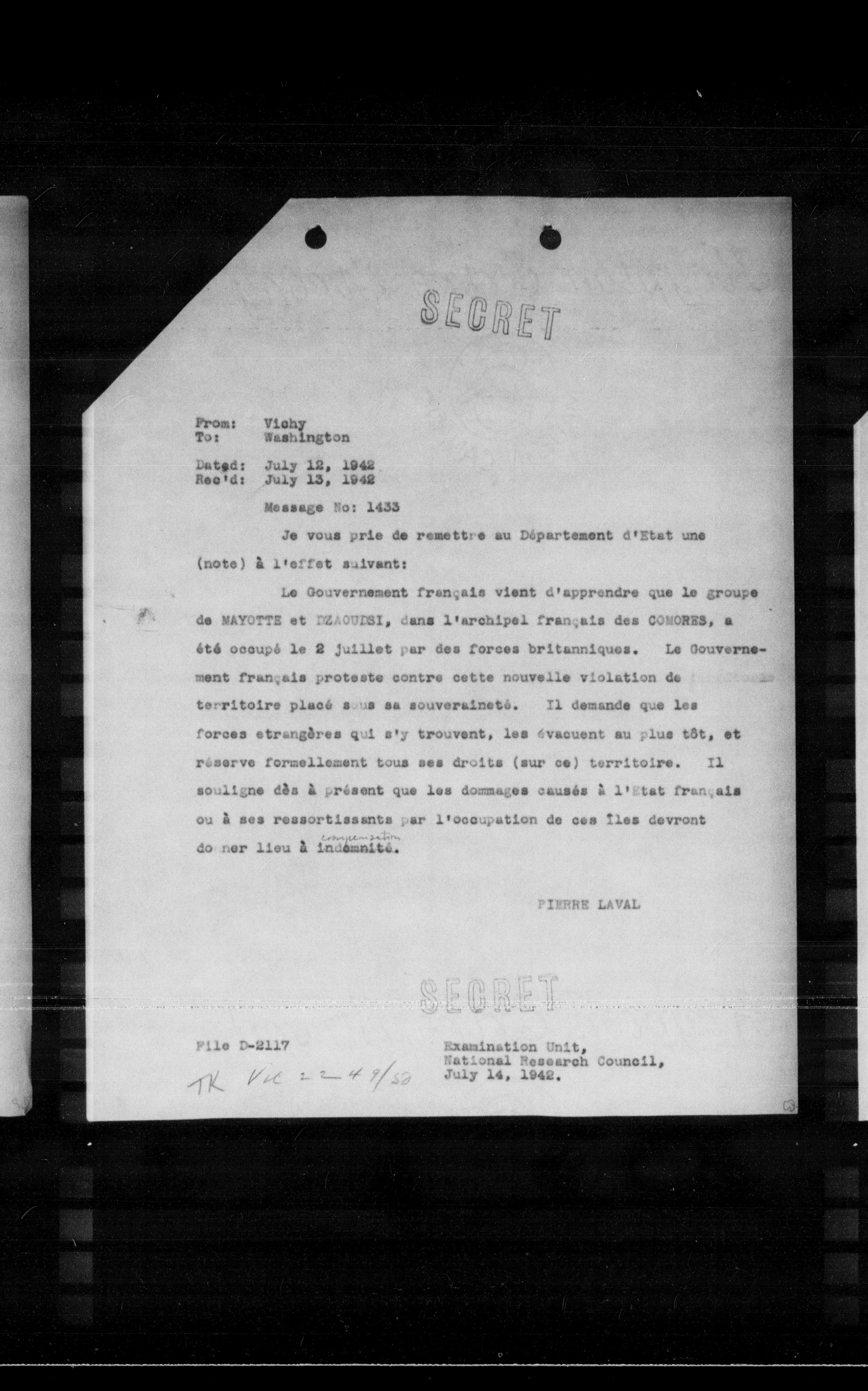 Le Gouvernement français vient d'apprendre que le groupe de NAYOTTE et DEACUDSI, dans l'archipel français des CONGRES, a été occupé le 2 juillet par des forces britanniques. Le Gouvernement français proteste contre cette nouvelle violation de territoire placé sous sa souveraineté. Il demande que les forces étrangères qui s'y trouvent, les évasuent au plus tôt, et réserve formellement tous ses droits (sur ce) territoire. Il souligne dès à présent que les dommages causés à l'État français ou à ses ressortissants par l'occupation de ces îles devront donner lieu à indemnité.