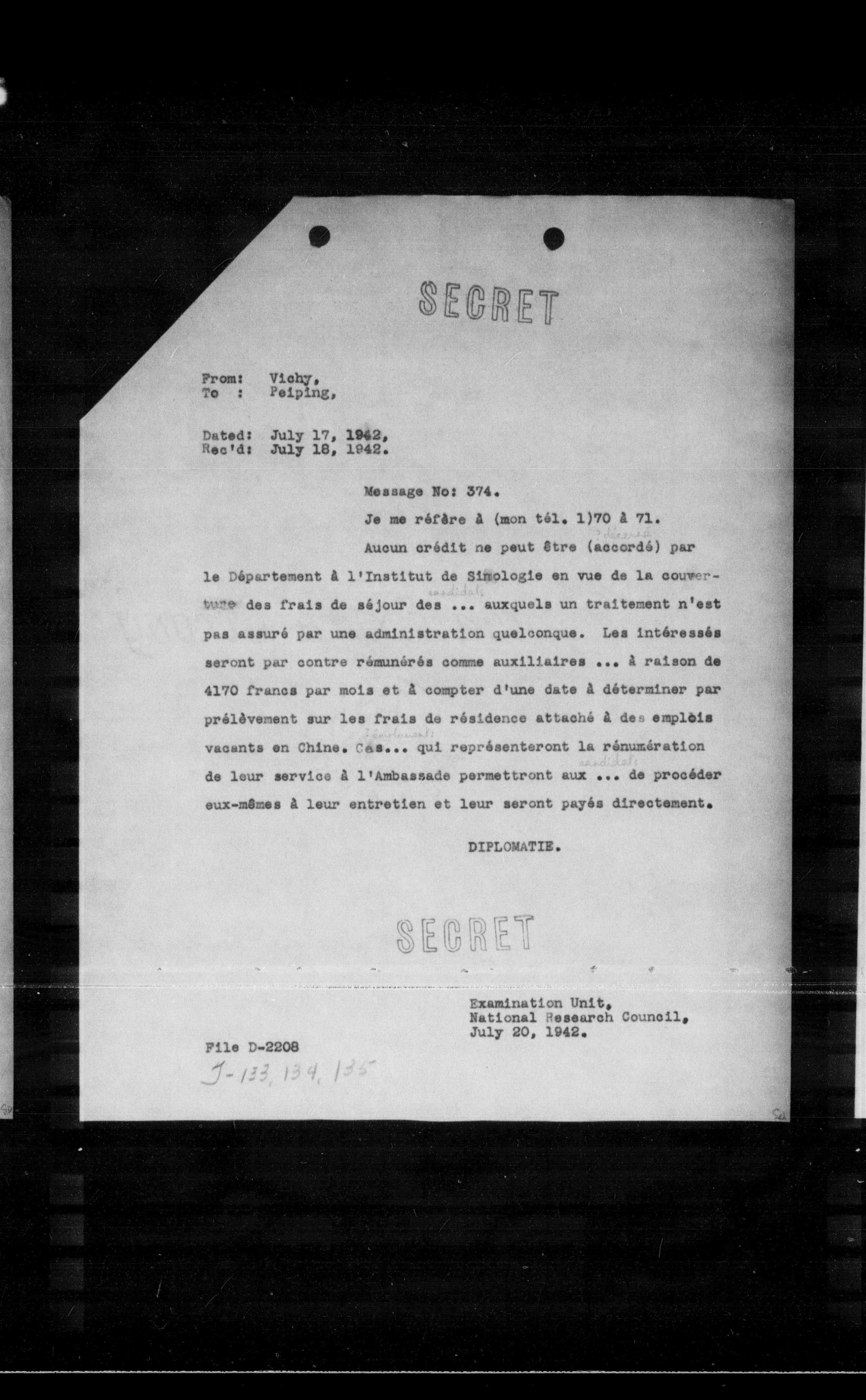 Aucun crédit ne peut être (accordé) par le Département à l'Institut de Sittologie en vue de la couverture des frais de séjour des ... auxquels un traitement n'est pas assuré par une administration quelconque. Les intéressés seront par contre rémunérés comme auxiliaires ... à raison de 4170 francs par mois et à compter d'une date à déterminer par prélèvement sur les frais de résidence attaché à des emplois vacants en Chine. Ces ... qui représenteront la rémunération de leur service à l'Ambassade permettront aux ... de procéder eux-mêmes à leur entretien et leur seront payés directement.