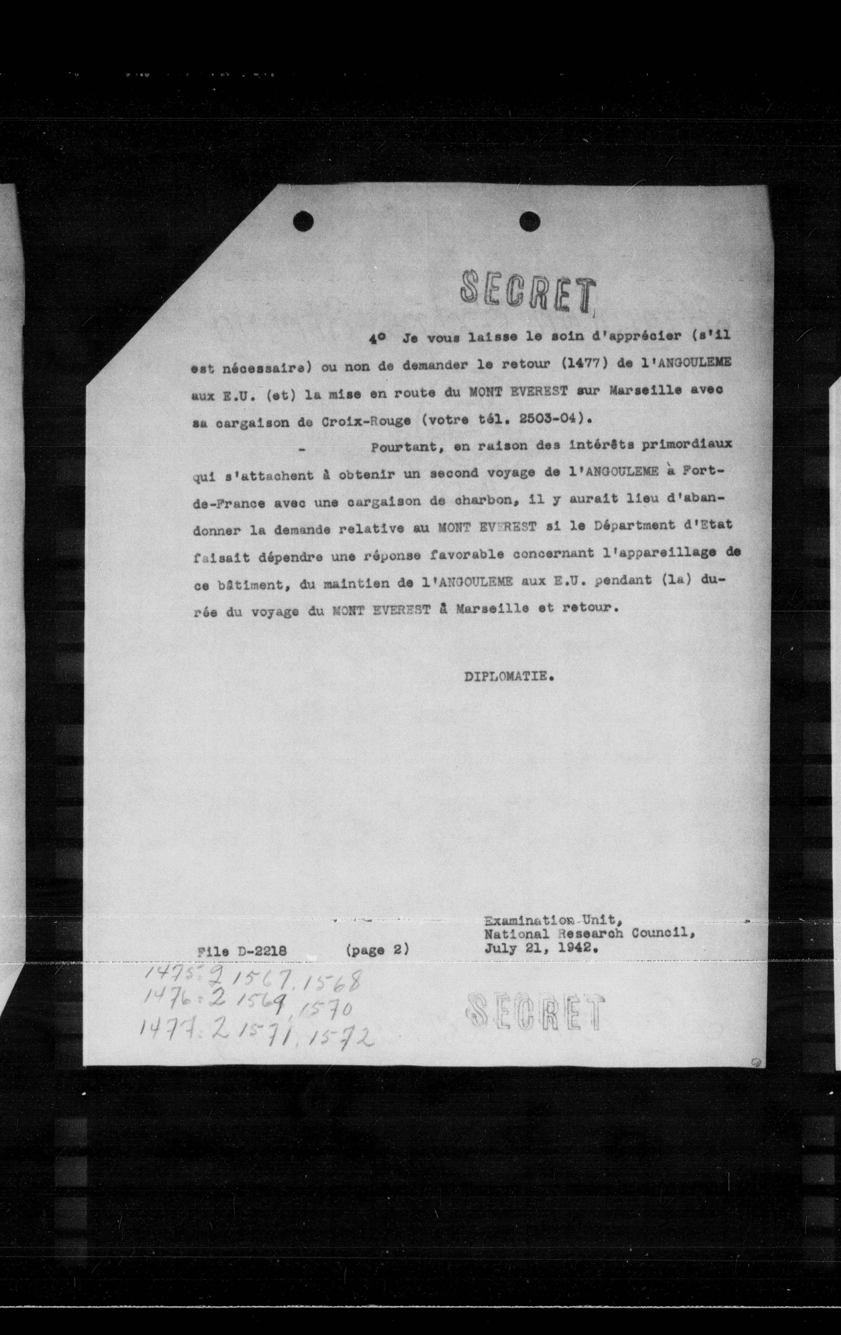 $4^{0}$ Je vous laisse le soin d'apprécier (s'il est nécessaire) ou non de demander le retour (1477) de l'ANGOULEME aux E.U. (et) la mise en route du MONT EVERET sur Marseille avec sa cargaison de Croix-Rouge (votre tél. 2503-04).