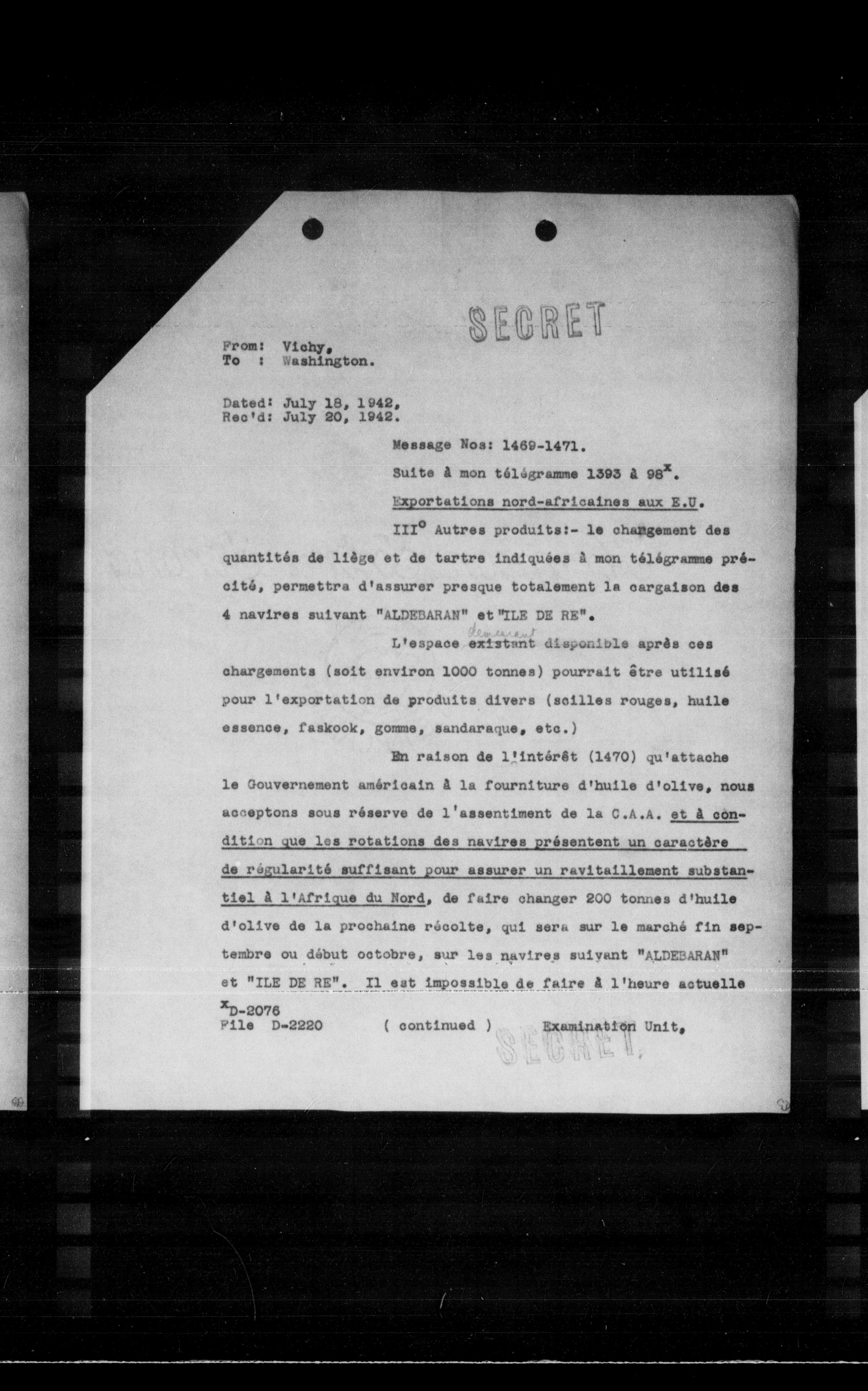 En raison de l'intérét (1470) qu'attache le Gouvernement américain a la fourniture d'huile d'olive, nous acceptons sous réserve de l'assentiment de la C.A.A. et à condition que les rotations des navires présentent un caractère de régularité suffisant pour assurer un ravitaillement substantiel à l'afrique du Nord, de faire changer 200 tonnes d'huile d'olive de la prochaine récolte, qui sera sur le marché fin septembre ou début octobre, sur les navires suiyant "ALDEBARAN" et "ILE DE RE". Il est impossible de faire à l'heure actuelle ${ }^{\text {a }}$ D-2076