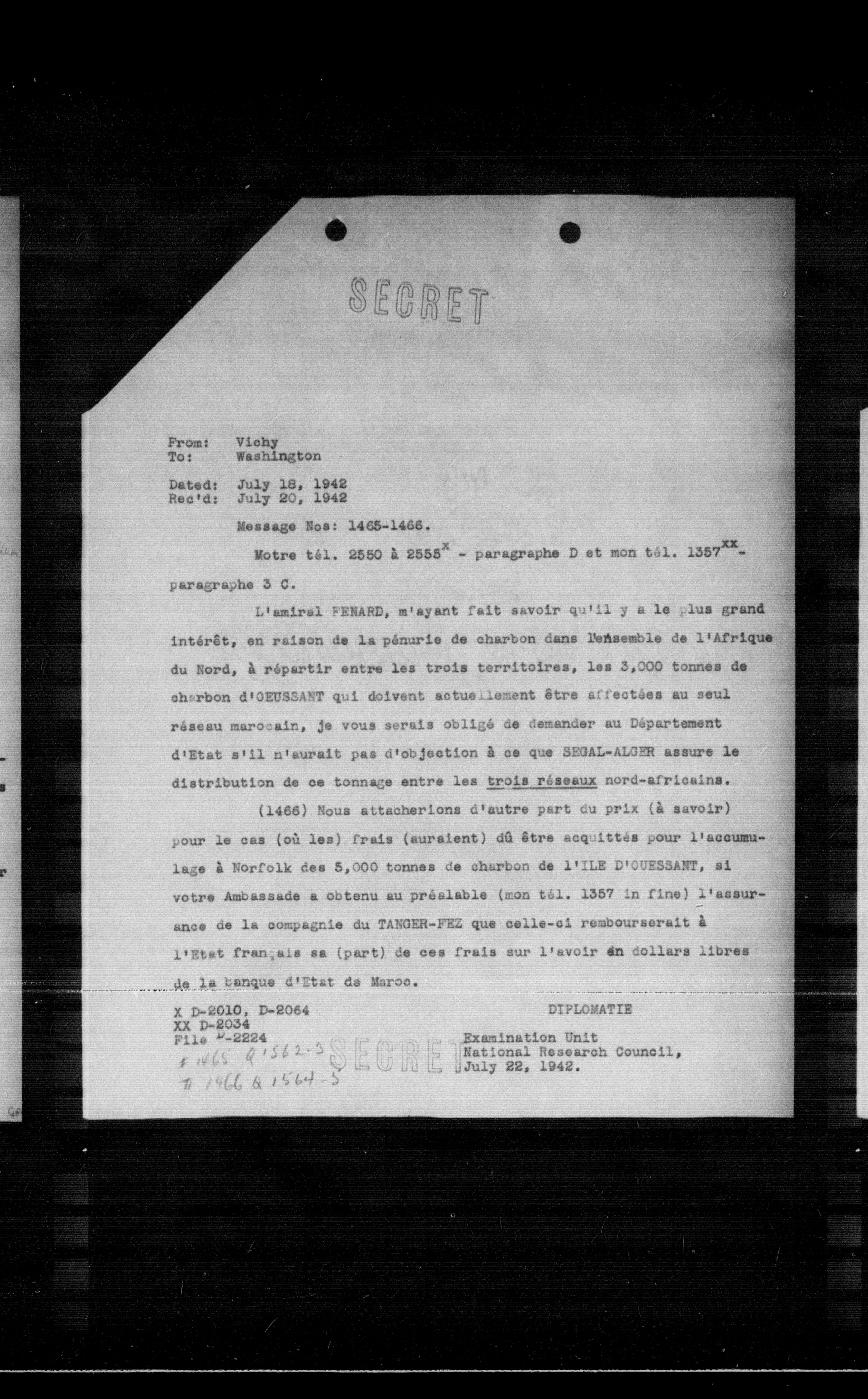 L'amiral FENARD, m'ayant fait savoir qu'il y a le plus grand intérêt, en raison de la pénurie de charbon dans l'ensemble de l'Afrique du Nord, à répartir entre les trois territoires, les 3,000 tonnes de charbon d'OEUSSANT qui doivent actuellement être affectées au seul réseau marocain, je vous serais obligé de demander au Département d'Etat s'il n'aurait pas d'objection à ce que SEGAL-ALGER assure le distribution de ce tonnage entre les trois réseaux nord-africains.