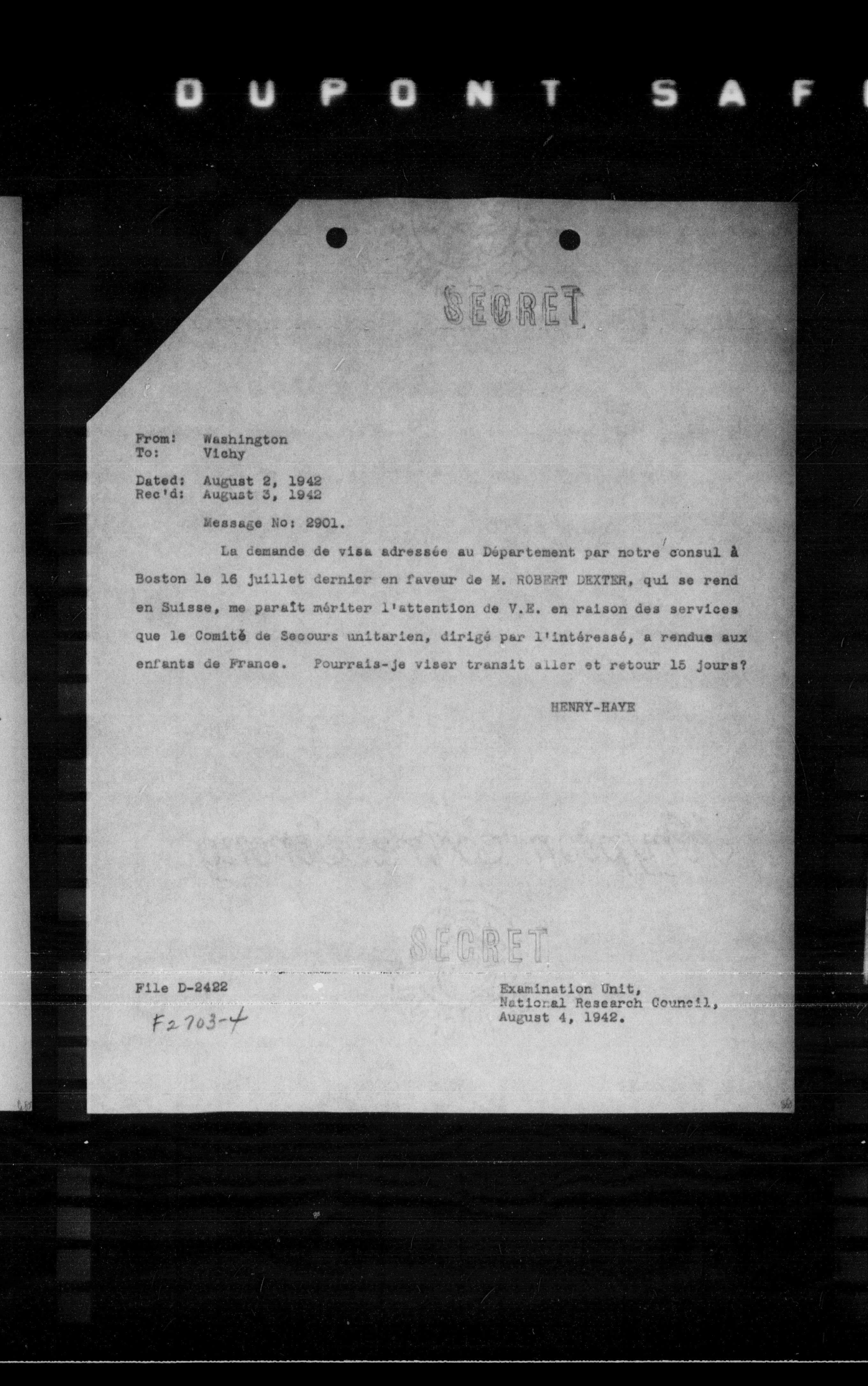 La demande de visa adressée au Département par notre cónsul a Boston le 16 juillet dernier en faveur de M. HOBERT DEXTER, qui se rend en Suisse, me parait mériter l'attention de V.E. en raison des services que le Comite de sesours unitarien, dirigé par l'intéressé, a rendue aux enfants de France. Fourreia-je viser transit aller et retour 15 jours?
