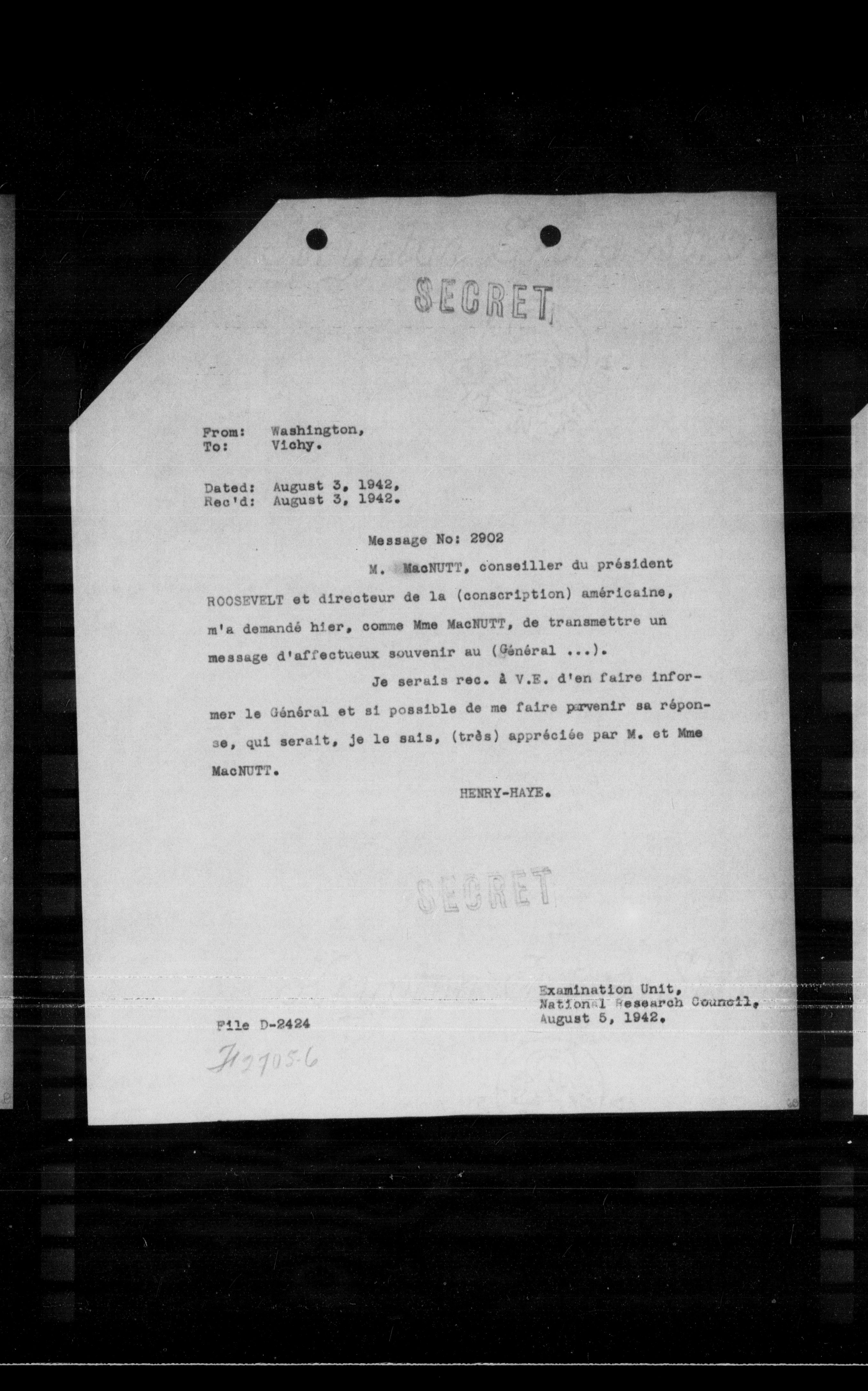 W. MacNUTT, conseiller du président ROOSEVELT et directeur de la (conscription) américaine, m'a demandé hier, comme Mme MacNUTT, de transmettre un message d'affectueux souvenir au (Général ...).