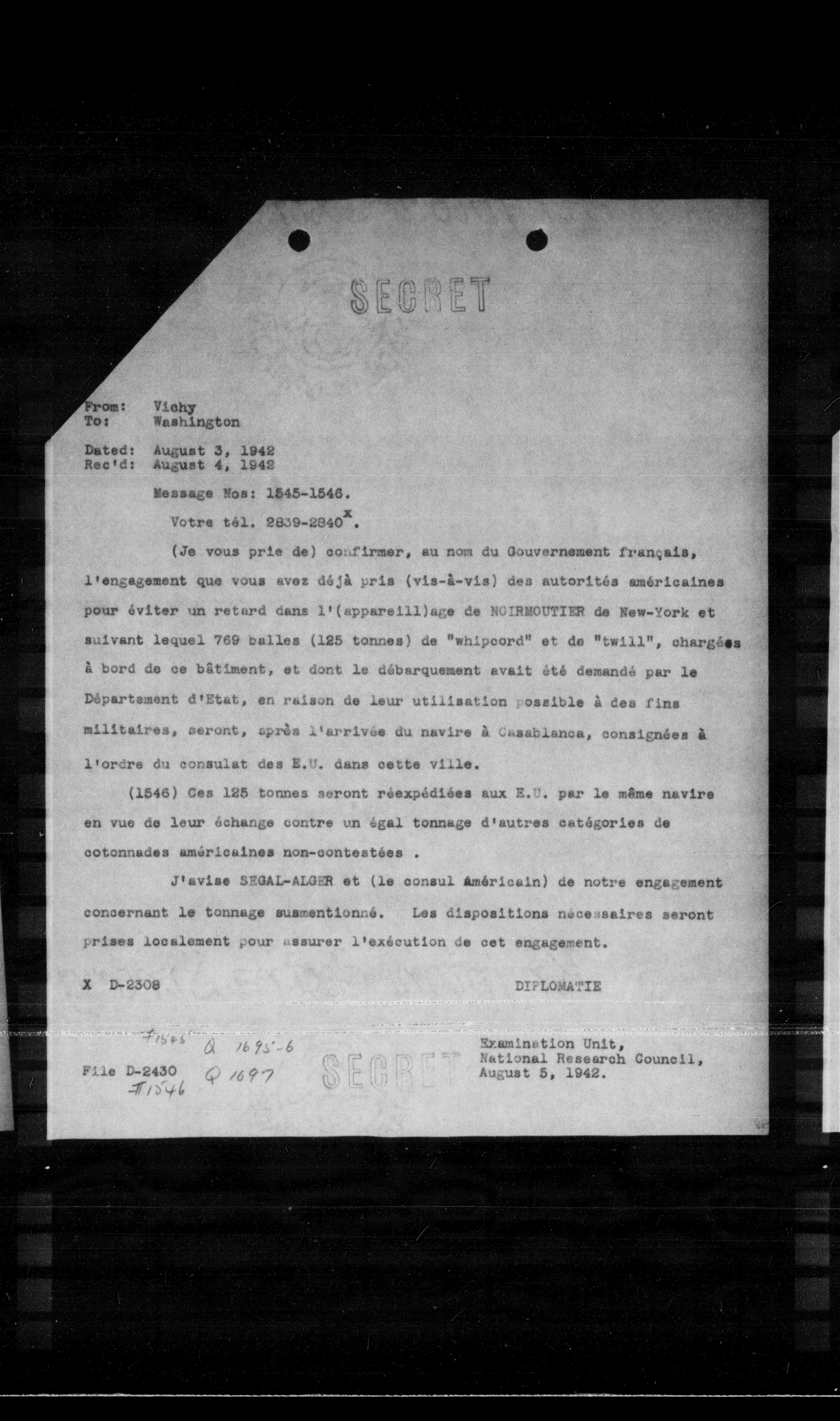 (Je vous prie de) confirmer, au nom du Gouvernement français, l'engagement que vous avez déjà pris (vis-à-vis) des autorités américaines pour éviter un retard dans l'(apparelli)age de NOIREOUTIER de New-York et suivant lequel 769 balles ( 125 tonnes) de "whipcord" et de "twill", chargées à bord de ce bâtiment, et dont le débarquement avait été demandé par le Département d'Etat, en raison de leur utilisation possible à des fins militaires, seront, après l'arrivée du navire à Casablanca, consignées à l'ordre du consulat des E.U. dans cette ville.
