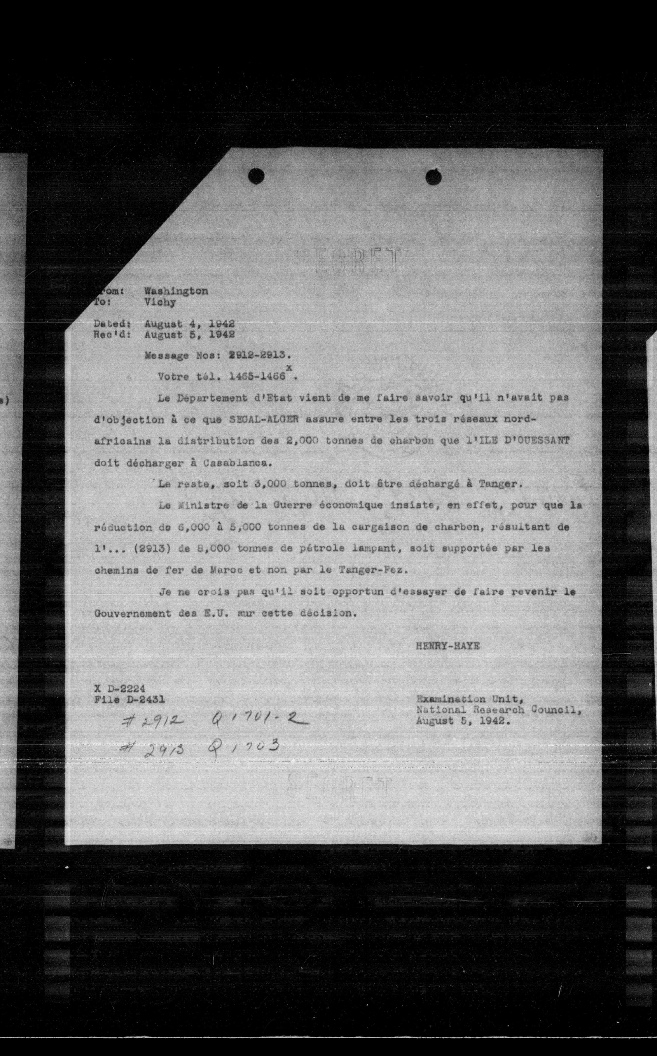 Le Département d'Etat vient de me faire savoir qu'il n'avait pas d'objection à ce que SEGAL-ALGER assure entre les trois réseaux nordafricains la distribution des 2,000 tonnes de charbon que l'ILE D'OUESSANT doit décharger à Casablanca.