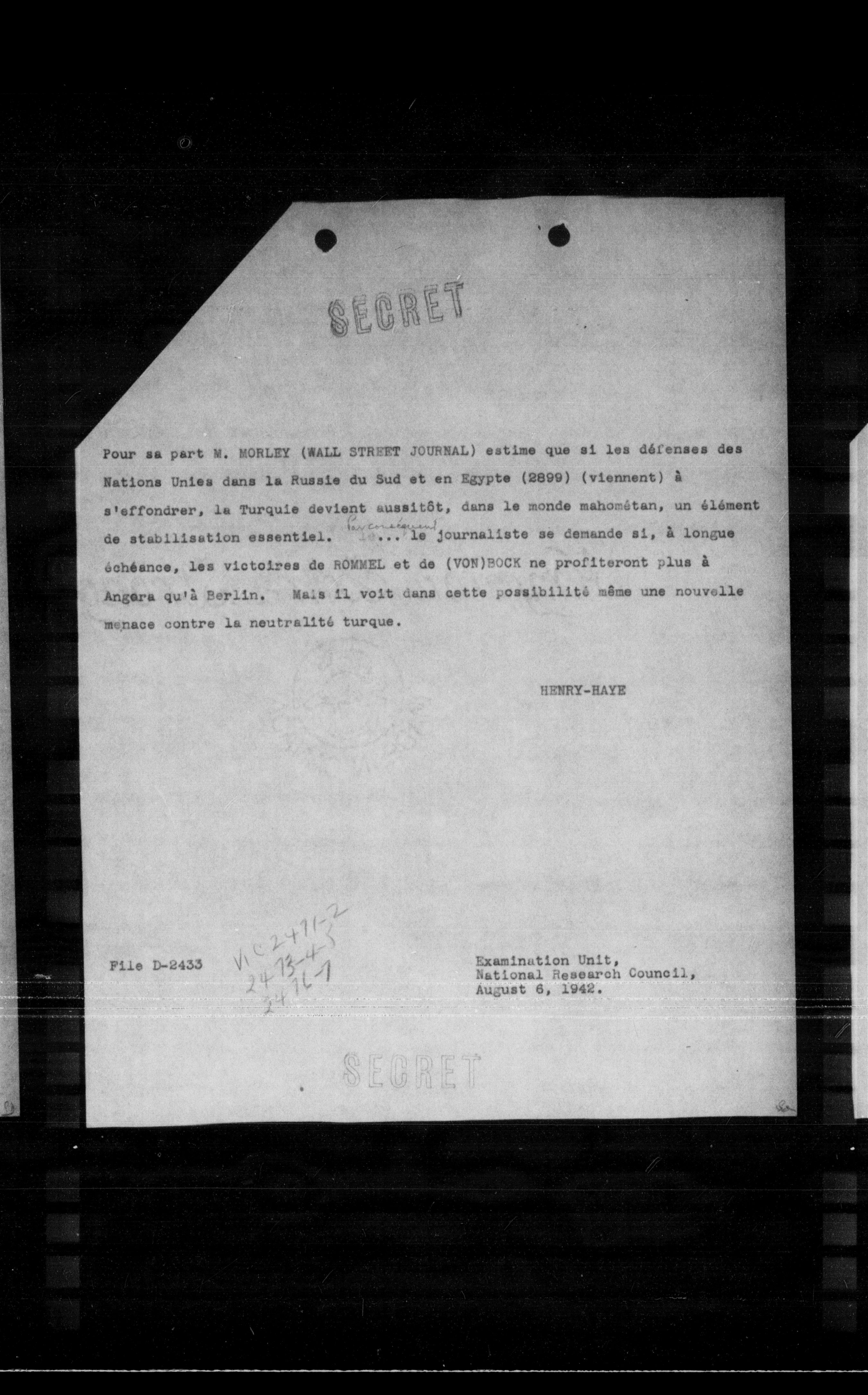 - Pour sa part M. MORLEY (WALL STREET JOURNAL) estime que si les défenses des Nations Unies dans la Russie du Sud et en Egypte (2899) (viennent) a s'effondrer, la Turquie devient aussitôt, dans le monde mahométan, un élément de stabilisation essentiel. . . . le journaliste se demande si, a longue cohénce, les victoires de ROEMEL et de (VON)BOCK ne profiteront plus à Angers qu'à Berlin. Mais il voit dans cette possibilité même une nouvelle menace contre la neutralité turque.