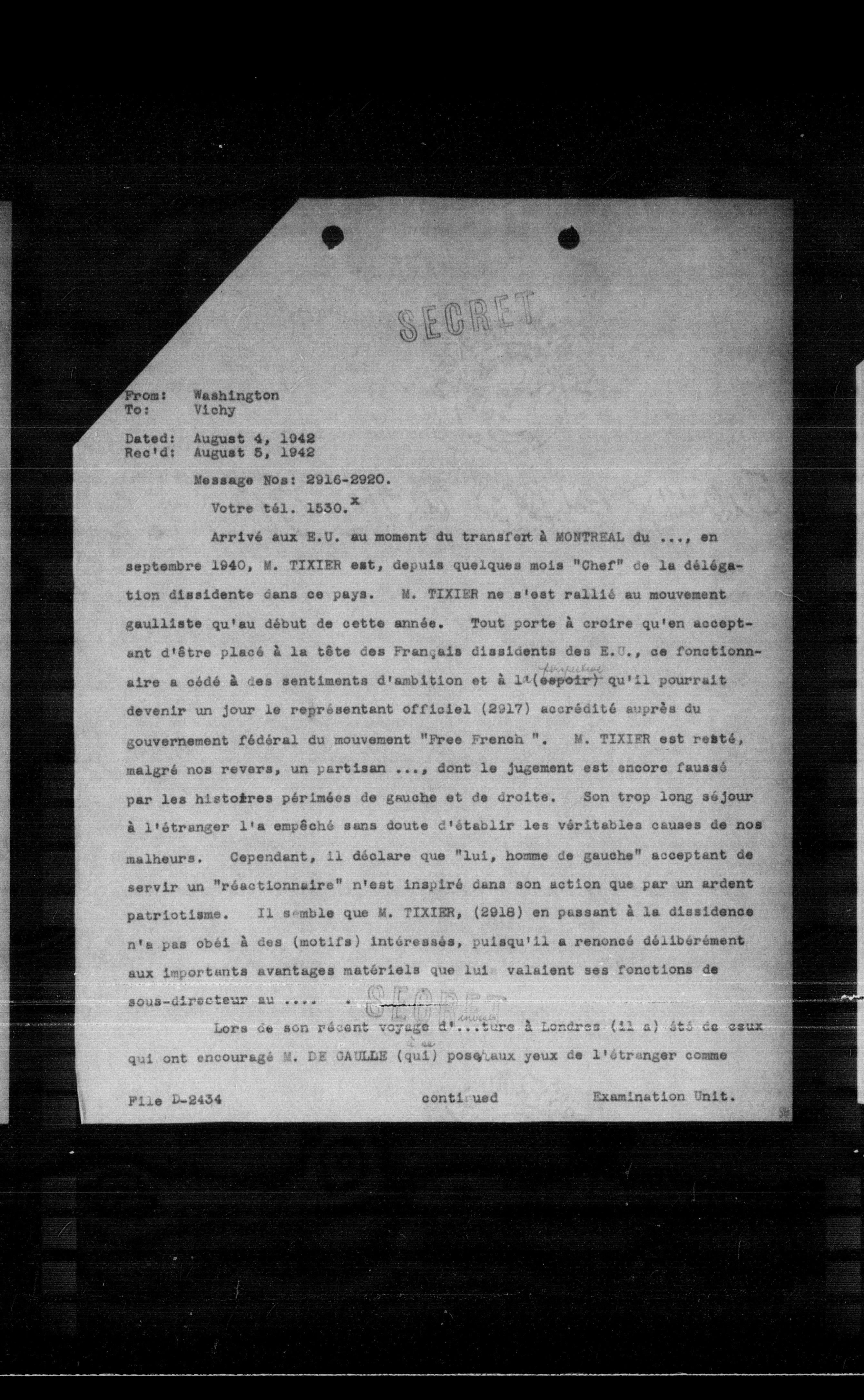 Arrivé aux E.U. au moment du transfert à MONTREAL du ..., en septembre 1940, M. TIXIER est, depuis quelques mois "Chef" de la délégation dissidente dans ce pays. M. TIXIER ne s'est rallié au mouvement gaulliste qu'au début de cette année. Tout porte à croire qu'en acceptant d'être placé à la tête des Français dissidents des E.U., ce fonctionnaire a cédé à des sentiments d'ambition et à 19 (espoir) qu'il pourrait devenir un jour le représentant officiel (2917) accrédité auprès du gouvernement fédéral du mouvement "Free Frensh ". M. TIXIER est resté, malgré nos revers, un partisan ..., dont le jugement est encore faussé par les histoires périmées de gauche et de droite. Son trop long séjour à l'étranger l'a empêché sans doute d'établir les véritables causes de nos malheurs. Cependant, il déclare que "lui, homme de gauche" acceptant de servir un "réactionnaire" n'est inspiré dans son action que par un ardent patriotisme. Il semble que M. TIXIER, (2918) en passant à la dissidence n'a pas obéi à des (motifs) intéressés, puisqu'il a renoncé délibérément aux importants avantages matériels que lui valaient ses fonctions de sous-directeur au ....