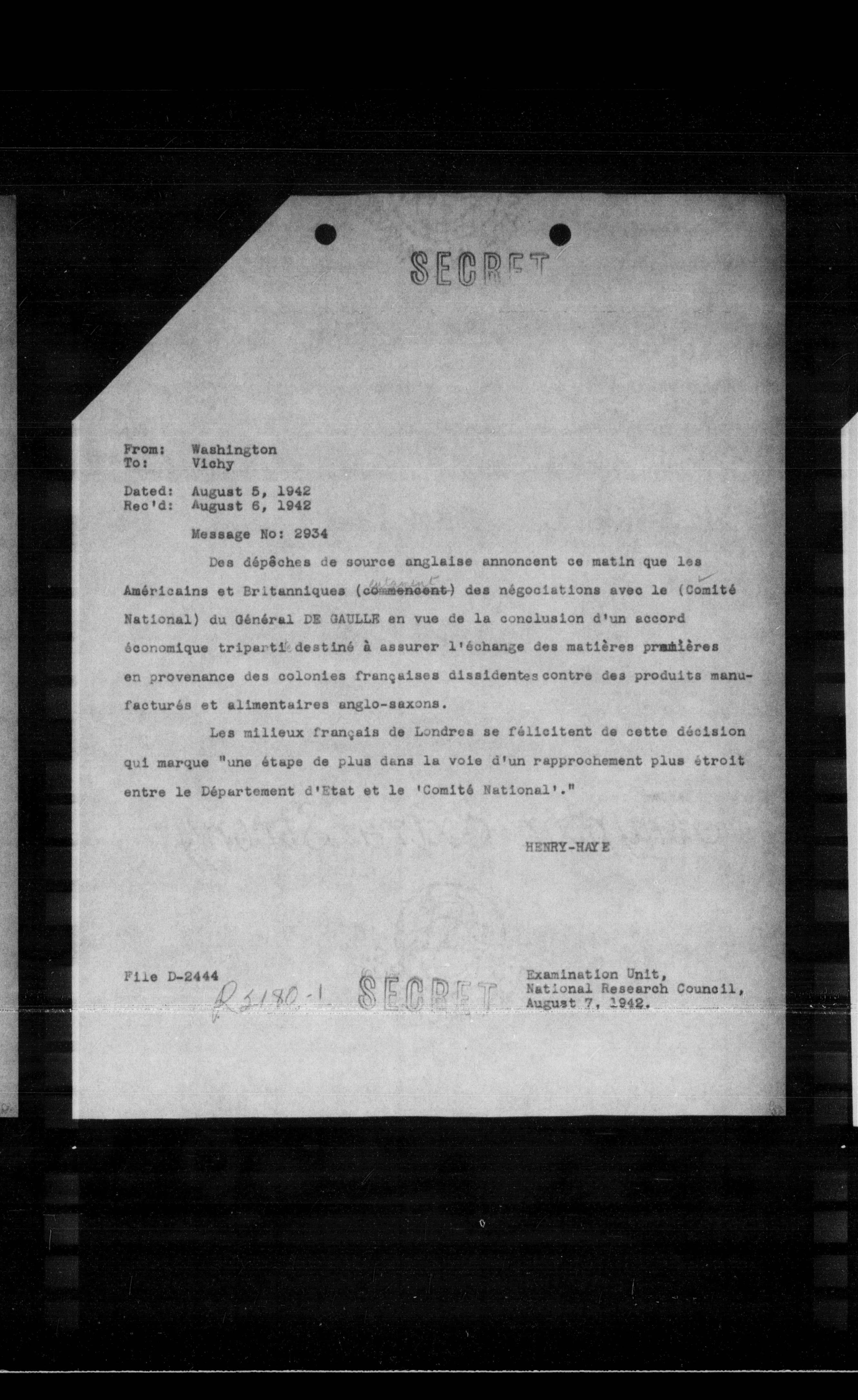 National) du Général DE GAULLE en vue de la conclusion d'un accord économique triparti destiné à assurer l'échange des matières premières en provenance des colonies françaises dissidentes contre des produits manufacturés et alimentaires anglo-saxons.