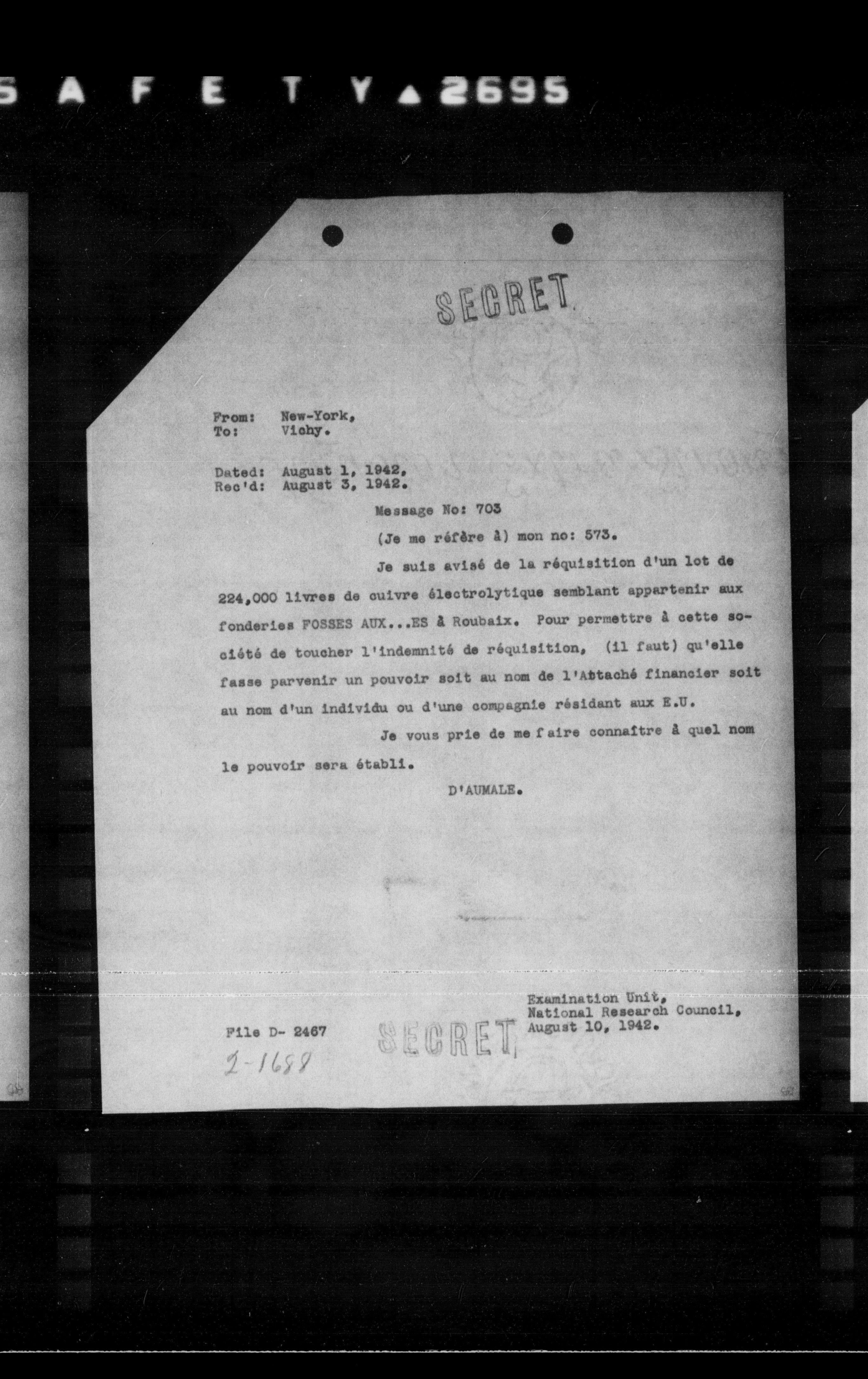Je suis avisé de la réquisition d'un lot de 224,000 livres de cuivre électrolytique semblant appartenir aux fonderies FOSSES AUX...ES à Roubaix. Pour permettre à cette société de toucher l'indemnité de réquisition, (il faut) qu'elle fasse parvenir un pouvoir soit au nom de l'Abtaché financier soit au nom d'un individu ou d'une compagnie résidant aux E.U.