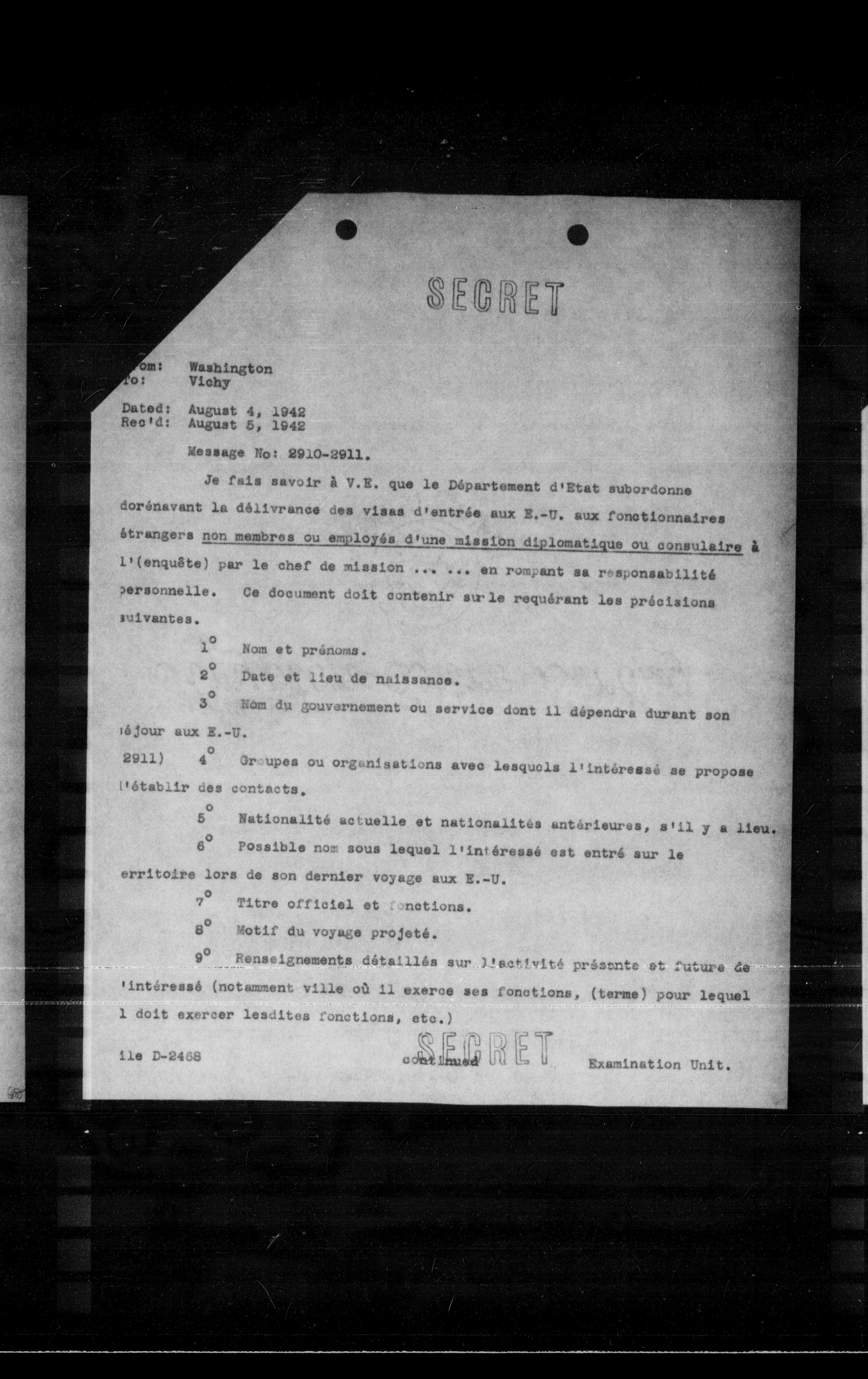 Je fais savoir à V.E. que le Département d'Etat subordonne dorénavant la délivrance des visas d'entrée aux E.-U. aux fonctionnaires étrangers non membres ou employés d'une mission diplomatique ou consulaire à l'(enquête) par le chef de mission ... ... en rompant sa responsabilité personnelle. Ce document doit contenir su le requérant les précisions suivantes.